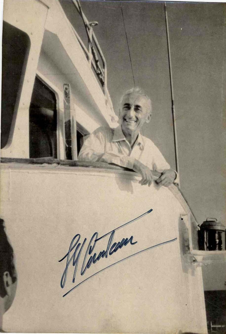 Wonderful photo signed ''JY Cousteau'' of the preeminent ocean explorer, ecologist and filmmaker. Entirely in his element, Cousteau smiles broadly while standing on the deck of a boat. 4.75'' x 6.75'' black and white photo in very good condition.