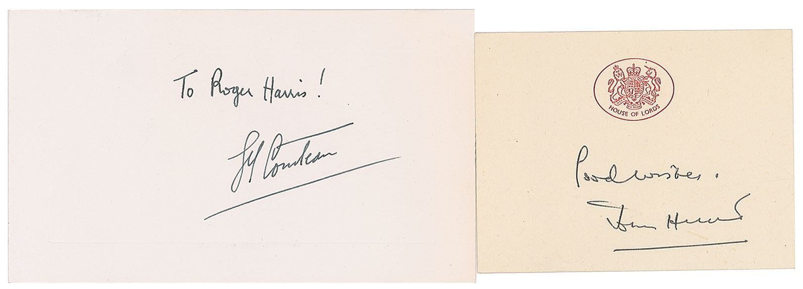 Two signatures of acclaimed explorers of sea and land: a felt tip signature and inscription, "To Roger Harris! Jacques Cousteau," on a white 5.75 x 3.25 card; and a ballpoint signature, "Good wishes, John Hunt," on an off-white 4 x 3 House of Lords card. In very fine condition.