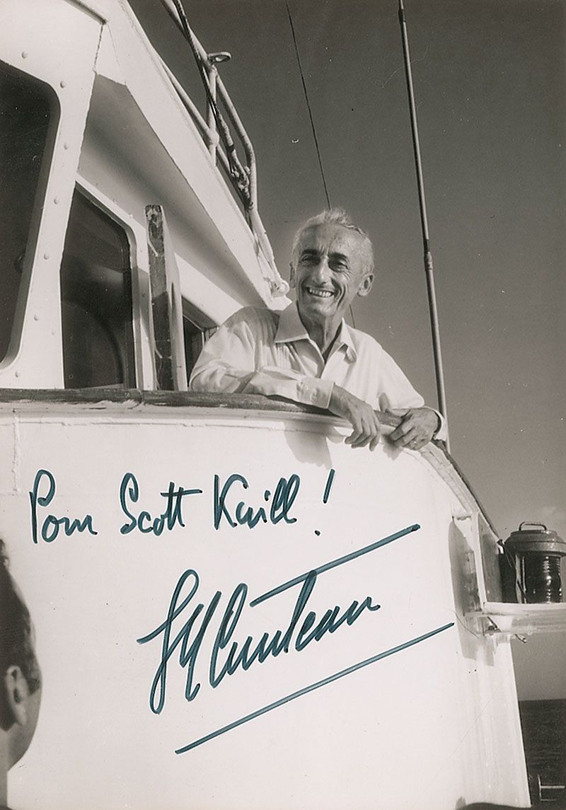 Glossy 3.5 x 5 photo of Cousteau on a boat, signed and inscribed in black felt tip. In fine condition.