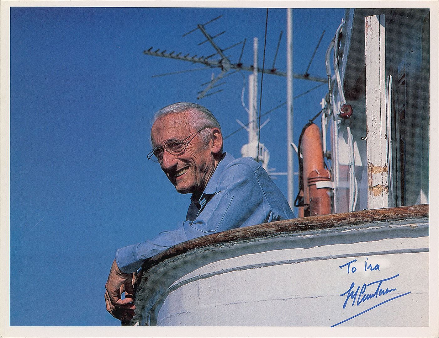 Color semi-glossy 11 x 8.5 photo of Cousteau with his arms resting on a boat railing, signed and inscribed in blue felt tip, "To Ira, J. Y. Cousteau." Reverse bears a Cousteau Society copyright stamp dated 1987. In fine condition.