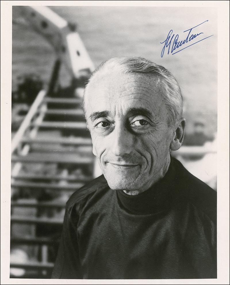 Glossy 8 x 10 head-and-shoulders portrait at sea, signed in blue felt tip, “J. Y. Cousteau.” In fine condition, with a couple of small corner creases.