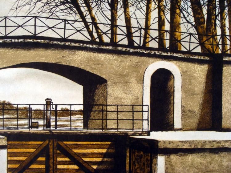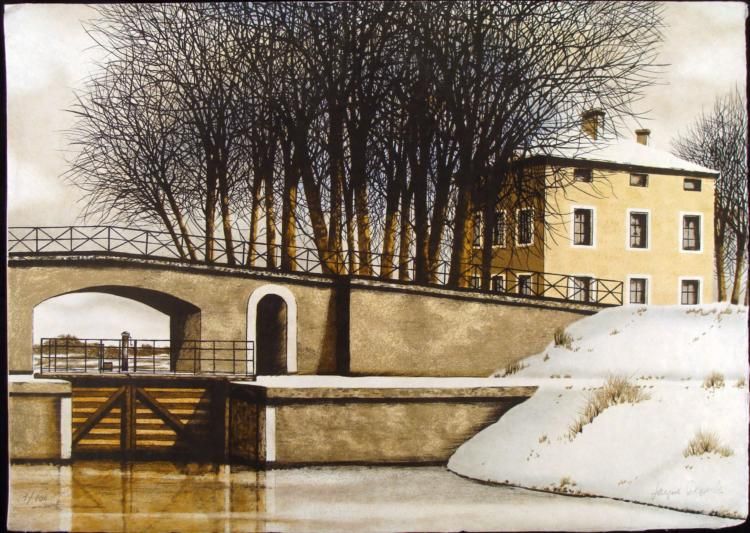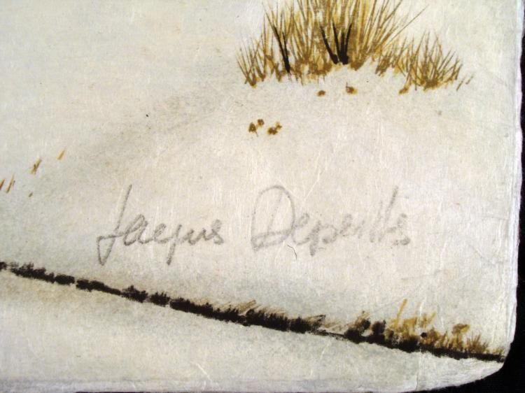 This print portrays the docks near a waterway in the winter. The natural hues and textures give this a realistic and classic style. Artist: Jacques DeperthesSignature: By the artist in pencil, lower rightEdition: Numbered 1/100, lower leftMedium: Lithograph on paperSheet size: 23 x 15 inches Image size: 30 x 21 1/4 inchesCondition: Excellent; some creases at the corners