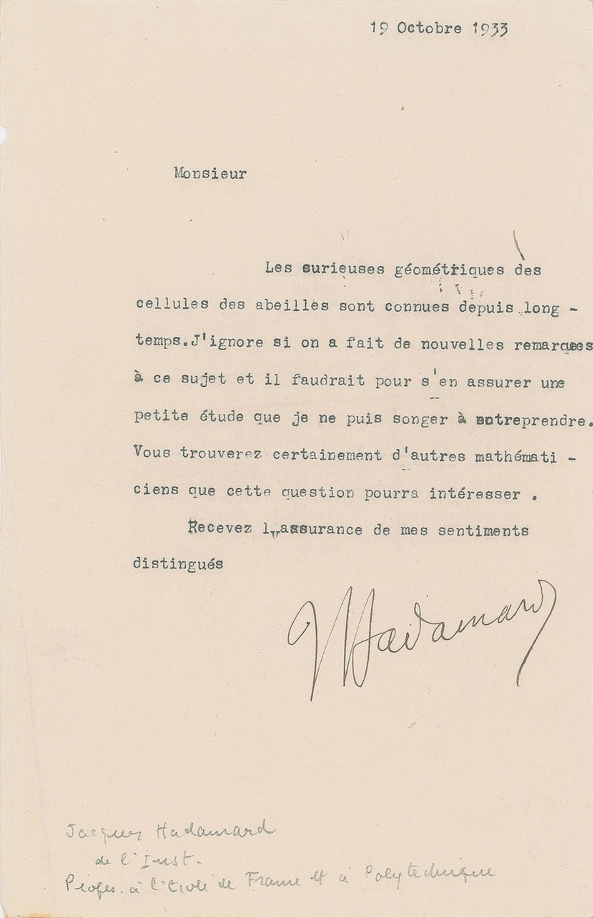 French mathematician (1865–1963) who made major contributions in number theory, complex function theory, differential geometry, and partial differential equations. TLS in French, signed “J. Hadamard,” one page, 5.25 x 8.25, October 19, 1933. Letter to a gentleman, in part (translated): "The surrogate geometry of bee cells has been known for a long time. I do not know if any further remarks have been made on this subject, and it will be necessary to make sure of a little study of it that I can not think of taking it. You will certainly find other mathematicians that this question may be of interest." In fine condition, with a crease, and small chip, toe the left edge.