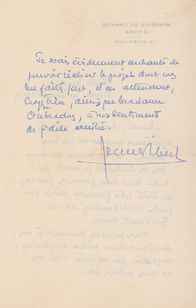 French composer (1890–1962). ALS in French, one page both sides, 5 x 8, Academie de France letterhead, January 20, 1949. Letter to Fernand Du Bradous wishing him a happy new year and congratulating him on a brilliant success. In fine condition, with a central vertical fold passing through signature and a few small spots of soiling.