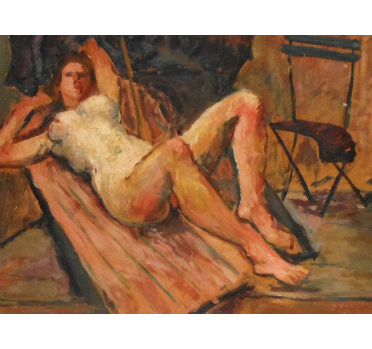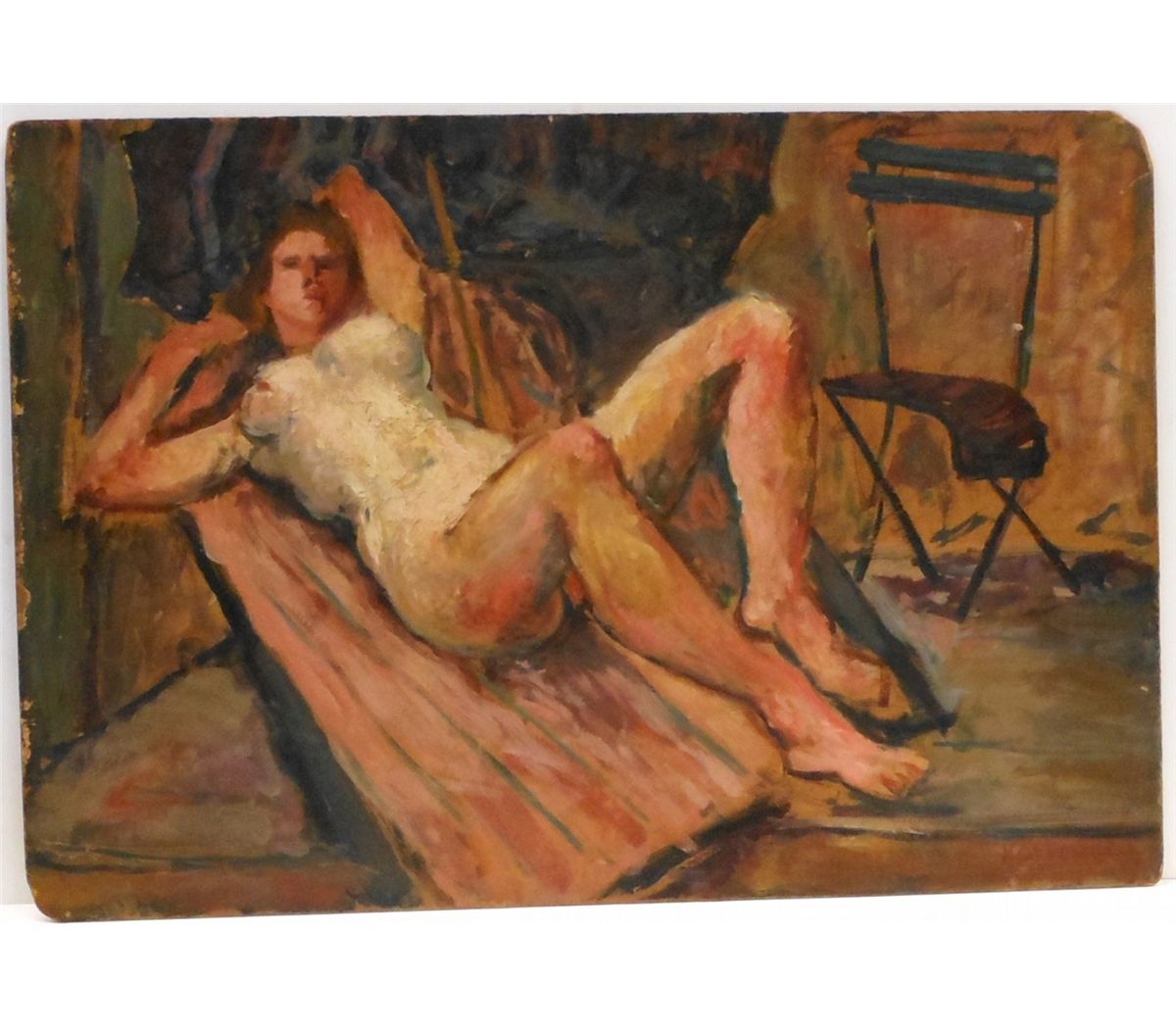 15" x 21 1/2" unframed oil on masonite, signed reclining nude woman in great condition with edge ware.