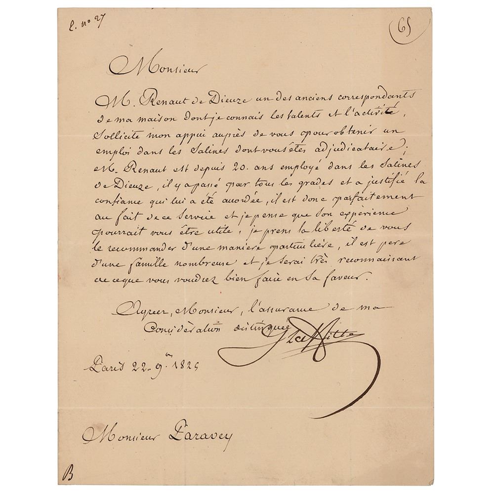 French banker and politician (1767–1844) who was an important figure in the development of new banking techniques during the early stages of industrialization in France. LS in French, signed “J. Laffitte,” one page, 6.25 x 8, November 22, 1829. Untranslated letter by Laffitte. In fine condition.