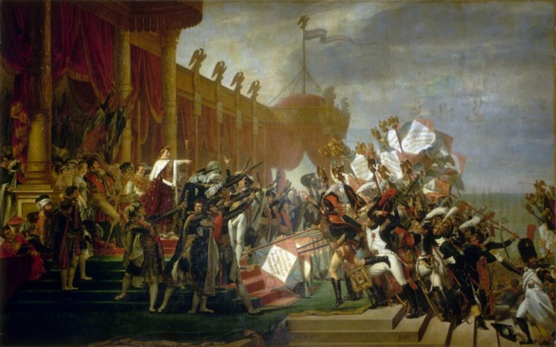 Artist: Jacques-Louis David - Title: The Army takes an Oath to the Emperor - Medium: Fine Art Reproduction Giclee on Canvas - Image Size: Approximately 14.5 inches x 20 inches - Unframed on Unstretched Canvas - Biography: Jacques-Louis David (30 August 1748 - 29 December 1825) was a French painter in the Neoclassical style, considered to be the preeminent painter of the era. In the 1780s his cerebral brand of history painting marked a change in taste away from Rococo frivolity toward classical austerity and severity and heightened feeling,harmonizing with the moral climate of the final years of the Ancien Régime.