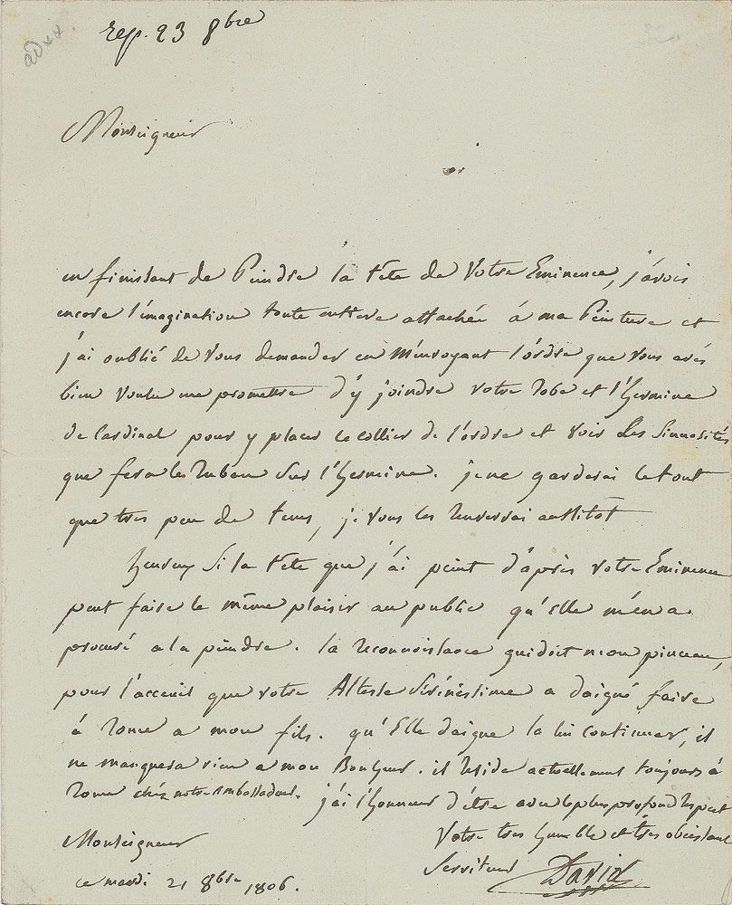 Written while hard at work on his monumental 'The Coronation of Napoleon'—a project that lasted from 1804 to 1807—this letter appears to refer to David's portrait of Cardinal Giovanni Battista Caprara. Cardinal Caprara appears in the massive work standing at the side of Pope Pius VII, whose hand is raised in blessing; the cardinal is indeed seen wearing an ermine and an order on a chain. David also accomplished a matching, standalone portrait of the pope and cardinal in the same poses during the same period. In 1806, David dedicated much of his time to filling in the costumes of the many subjects in 'The Coronation of Napoleon,' and he requested each of them to sit with him for an additional two hours. It is probable that when David met with Cardinal Caprara he focused on the details of his face, and then made this request for his clothes and accessories to be modeled later. Autographic material from Jacques-Louis David is extremely scarce, and with clear reference to a significant work this is an exceptionally desirable example.