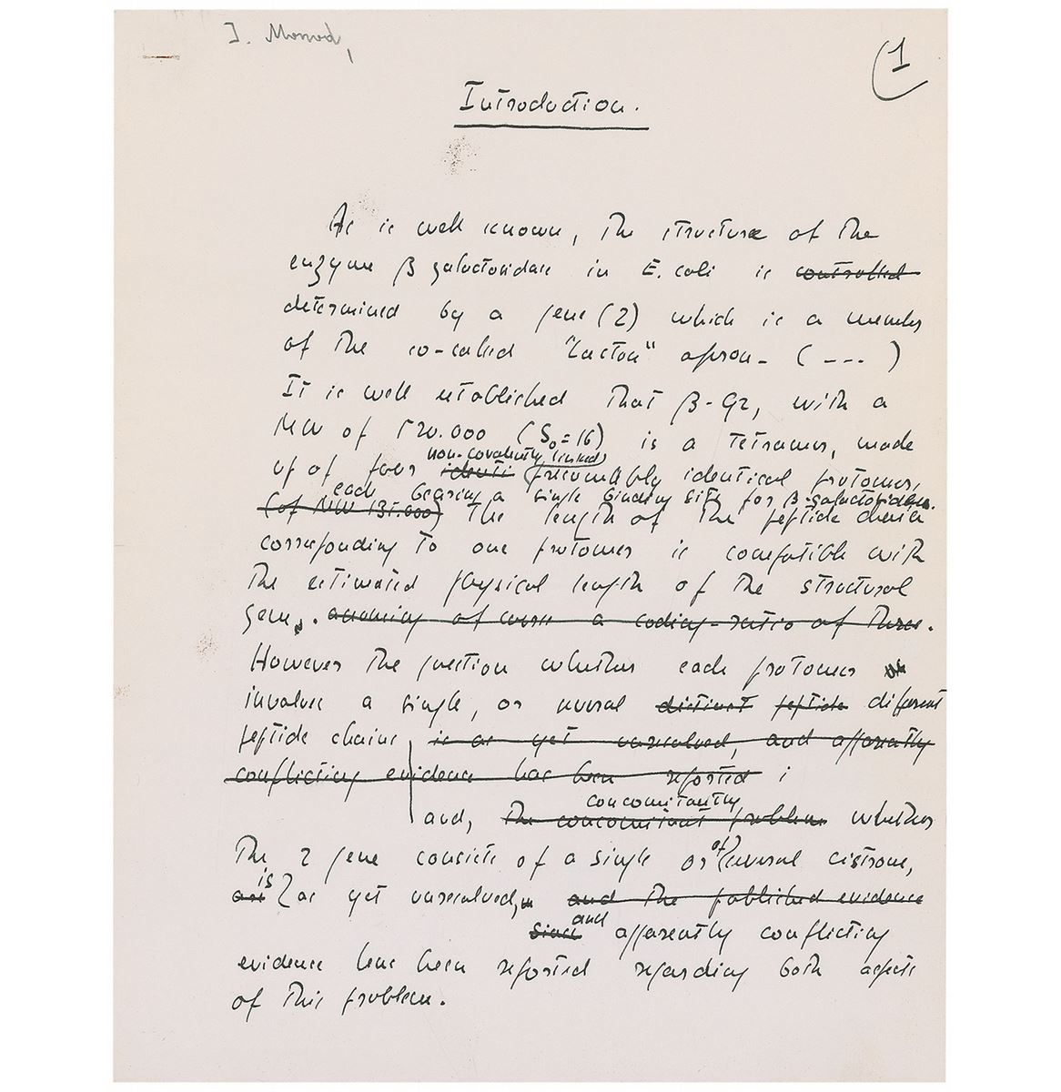 French biologist (1910–1976) who was awarded a Nobel Prize in Physiology or Medicine in 1965 for discoveries concerning genetic control of enzyme and virus synthesis. Handwritten manuscript, unsigned, 8.25 x 10.5, four pages, no date. Draft of the complete text of an introduction to a work on peptides, heavily revised and corrected throughout by Monod. In fine condition.