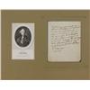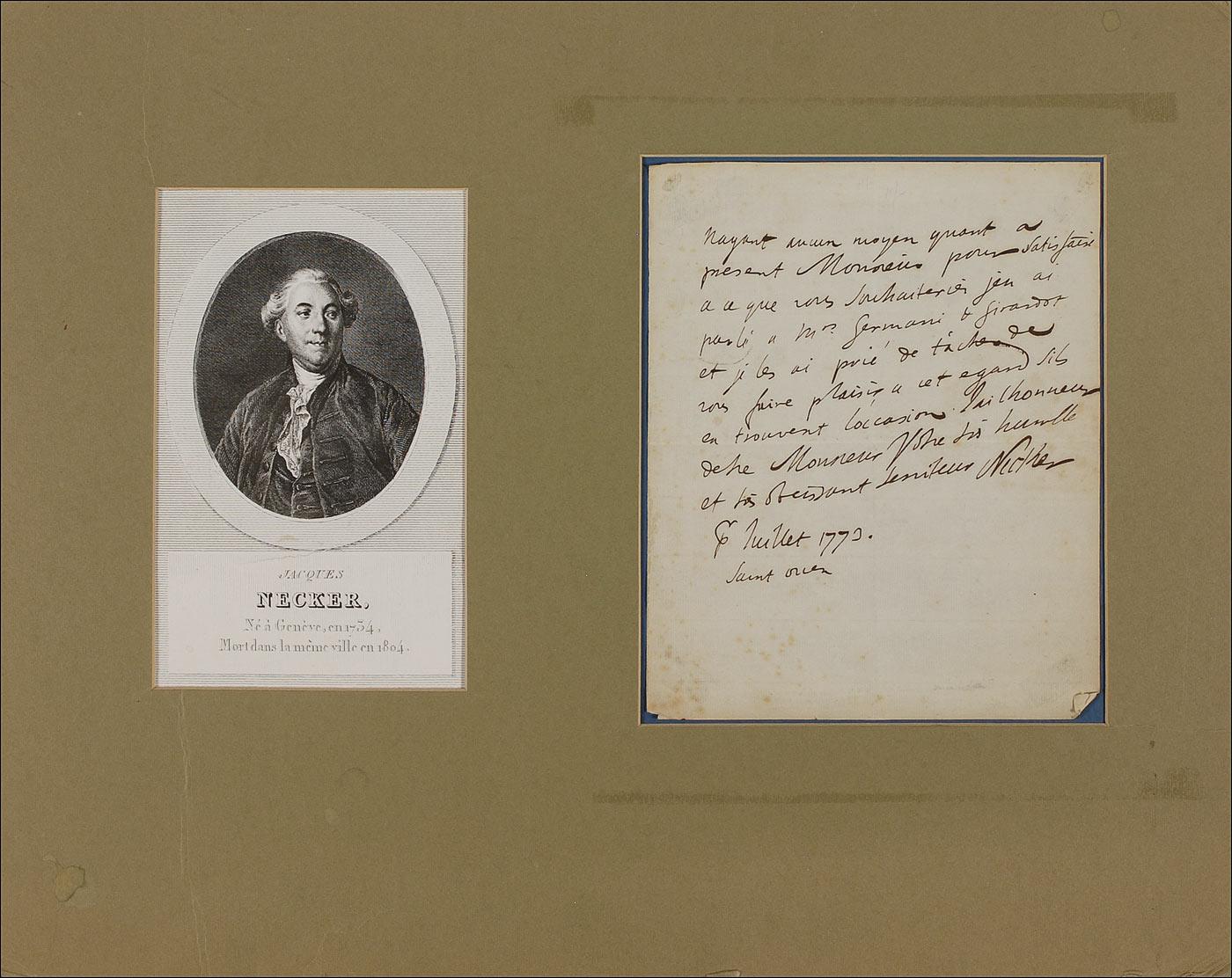 French statesman of Swiss birth (1732–1804) and finance minister of Louis XVI, a post he held in the lead-up to the French Revolution in 1789. ALS in French, signed “Necker,” one page, 7.25 x 9, July 6, 1773. In full (translated): “Having no means at present, Monsieur, to what you would wish, I have spoken about it to Mme Germani and Girandot and have asked them to try and please us in that regard if they find the time.” In very good condition, with bent lower right corner, chipped lower left corner, intersecting folds, mild toning, scattered foxing, and show-through from tape stain on the reverse not affecting the text. Matted, with a portrait, to an overall size of 20 x 16.