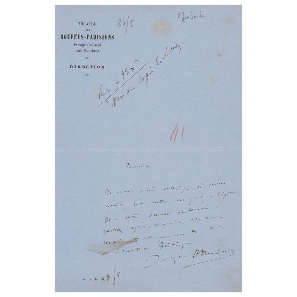 ALS in French, one page, 5.25 x 8.25, Theatre des Bouffes-Parisiens letterhead, December 22, 1858. Untranslated handwritten letter. In fine condition, with some small stains to the top, and a brush to one word of text. Offenbach founded the Theatre des Bouffes-Parisiens in 1855, resigning as its director in 1862.