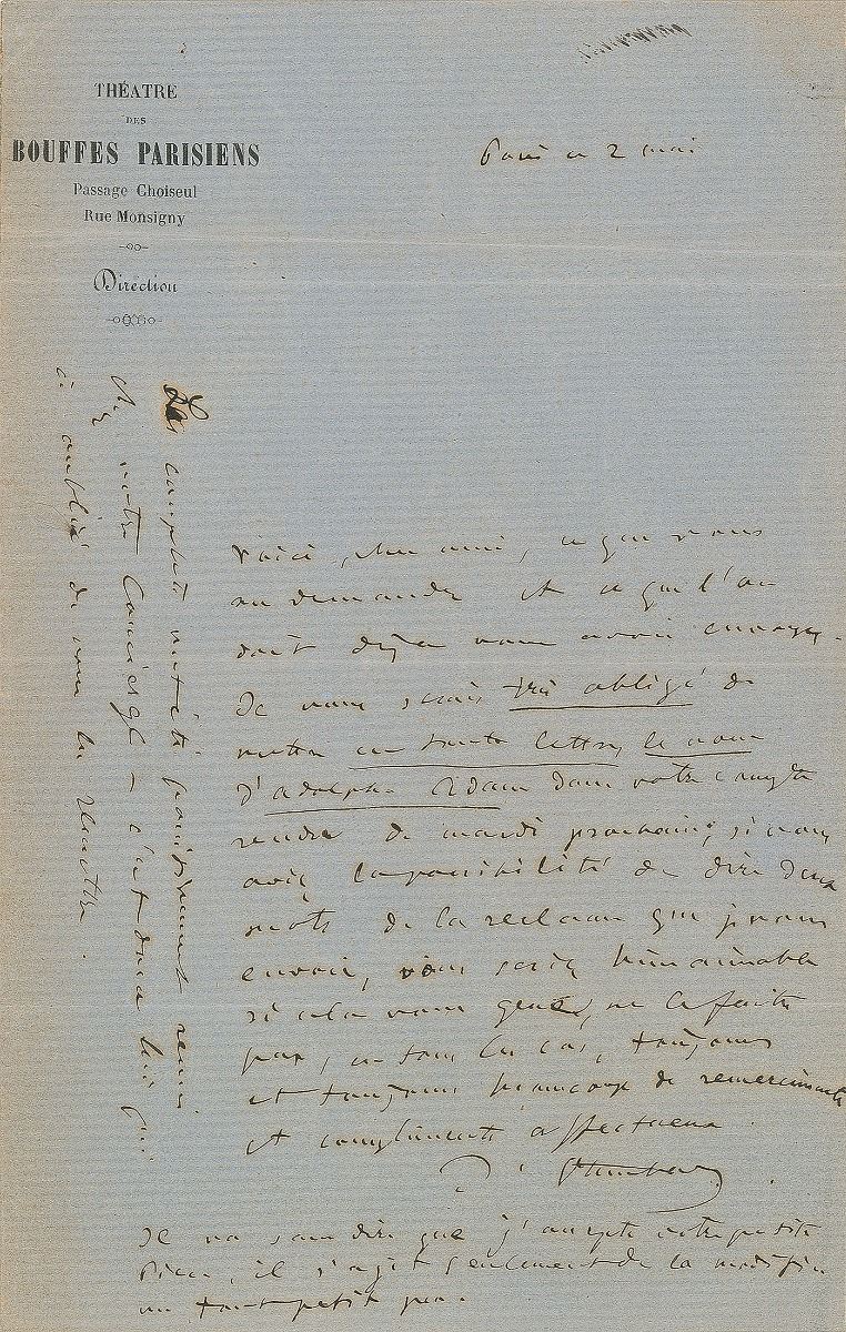 French composer (1819–1880) best known for his popular stage works, most notably Orpheus in the Underworld (including the famous ‘Can-Can’) and The Tales of Hoffmann. Untranslated ALS in French, signed “Offenbach,” one page, 5.25 x 8.25, Theatre des Bouffes Parisiens letterhead, June 2, no year. In very good to fine condition, with several horizontal folds and light ink erosion.