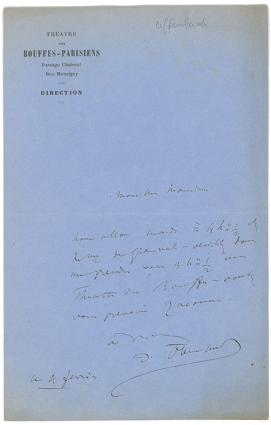 French composer (1819–1880) best known for his popular stage works, most notably Orpheus in the Underworld (including the famous 'Can-Can') and The Tales of Hoffmann. Untranslated ALS in French, signed “J. Offenbach,” one page, 5.25 x 8.5, Theatre des Bouffes-Parisiens letterhead, February 4. In very good to fine condition, with light toning to the perimeter, and creasing to the upper edge. Offenbach founded the Theatre des Bouffes-Parisiens in 1855, resigning as its director in 1862.