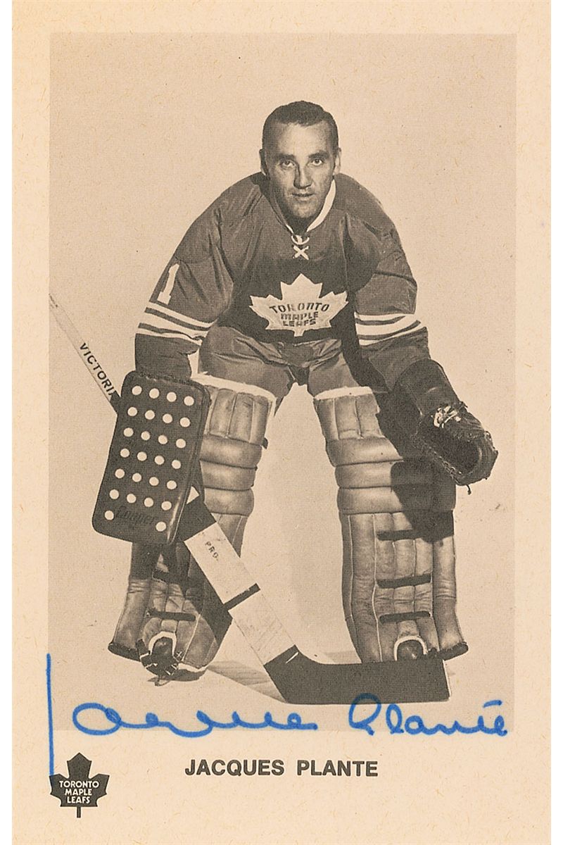 Uncommon 3.5 x 5.5 cardstock photo of Plante in his Toronto Maple Leafs uniform, neatly signed along the bottom in blue felt tip. In fine condition.