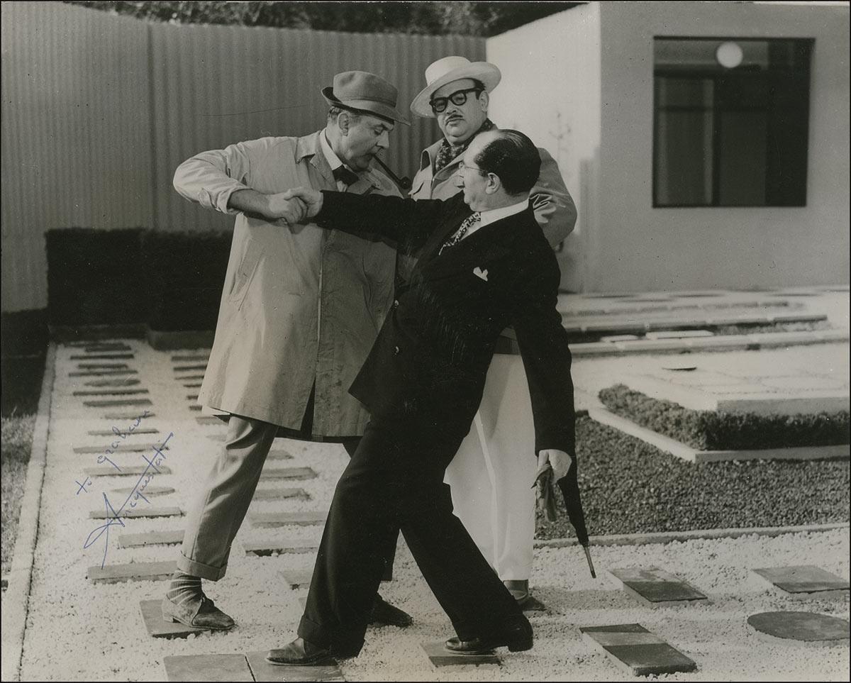 French film comedian known for his gangling, awkward character Mr. Hulot. Vintage 10 x 8 cardstock promotional photo from the film My Uncle, signed and inscribed in blue ink in French. In fine condition, with promotional information affixed to reverse. Pre-certified PSA/DNA and RRAuction COA.