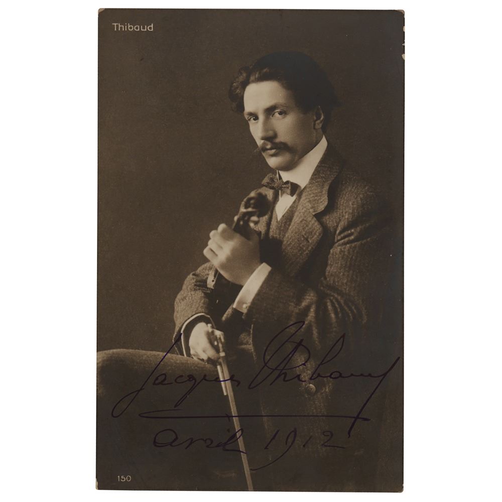 Vintage matte-finish 3.25 x 5.25 postcard photo of Thibaud posing with his violin, signed in purple ink, "Jacques Thibaud, Avril 1912." In fine condition.