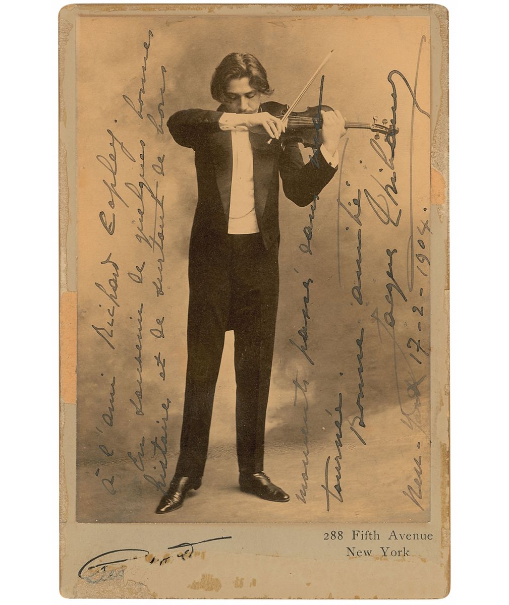 French violinist (1880–1953) who was part of a trio along with pianist Alfred Cortot and cellist Pablo Casals. Vintage 4.25 x 6.5 full-length cabinet photo of Thibaud playing his violin, signed and inscribed vertically on the image in black ink in French to Richard Copley and dated February 17, 1904. In very good condition, with surface loss to bottom border and edges, as well as adhesive remnants, and some light dampstaining.