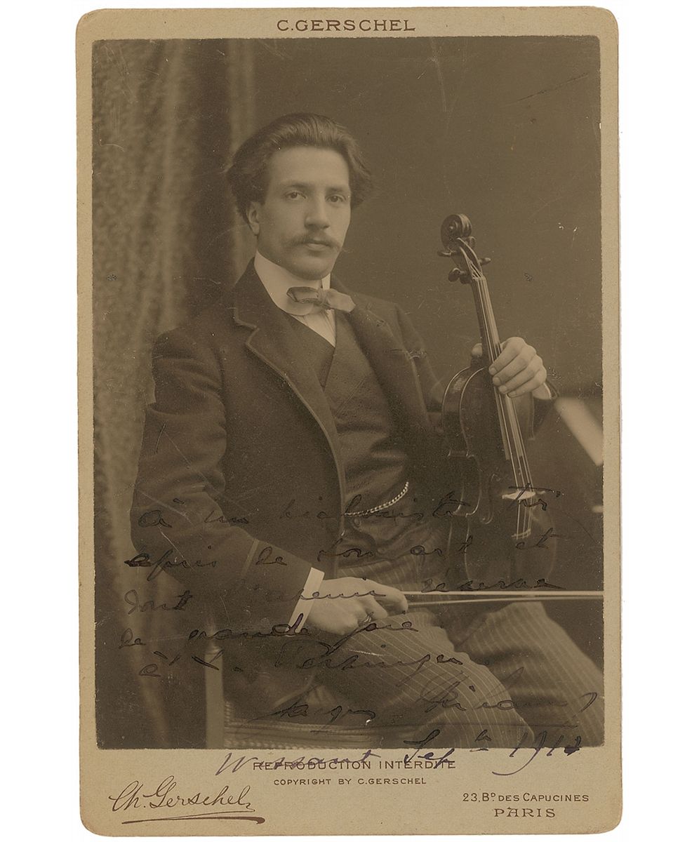 French violinist (1880–1953) who was part of a trio along with pianist Alfred Cortot and cellist Pablo Casals. Crystal-clear 4.25 x 6.5 cabinet photo of Thibaud seated and showing off his instrument, signed and inscribed in black ink with a lengthy French sentiment and dated September 1912. Published by C. Gerschel of Paris. Mild surface scuffs and poor to fair contrast of the signature and inscription against the dark background, otherwise fine condition. Originates from the collection of American violinist and pianist Louis Persinger (1887–1966), who trained at the Leipzig Conservatory and later taught at Juilliard, mentoring the likes of Yehudi Menuhin, Ruggiero Ricci, and Isaac Stern.