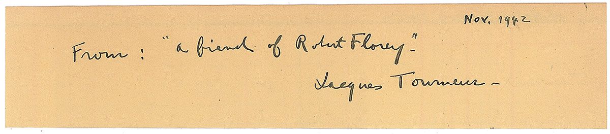 Director known for the low-budget horror films he made for RKO Studios, including Cat People, I Walked with a Zombie, and The Leopard Man (1904–1977). Vintage fountain pen signature and inscription, “From: ‘a friend of Robert Florey,’ Jacques Tourneur,” on an off-white 7.75 x 1.5 slip, with a November 1942 notation to the upper right. In fine condition, with slight show-through from mounting remnants to reverse.