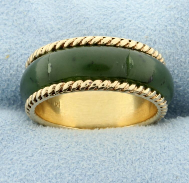 The Jade is nephrite type. 8.75mm wide. The jade has a few imperfections but hard to see! Size 8.25. Note: This ring cannot be sized. 5.7g