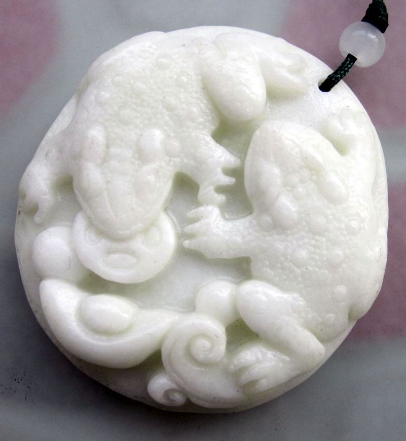 Size: 50mm x 45mm This Hand Carved jade has the image of Two Fortune Toad Frogs Coin Yuanbao Money. In Asia Mythology, Toad Frogs. Three legged toad, also called as Money Frog, is said to bring wealth, luck and good fortune in ancient legend. The color is white/green. Comes with Free silk cord & pouch. The jade is well polished, so its surface is sleek and smooth! JUST STUNNING!! Jade was the Royal Gemstone and the Stone of Heaven in Asia, It was the Symbol of Power and Associated with Heroes, and stood for morality. It is not only a decoration but also a symbol of ethics and norms.