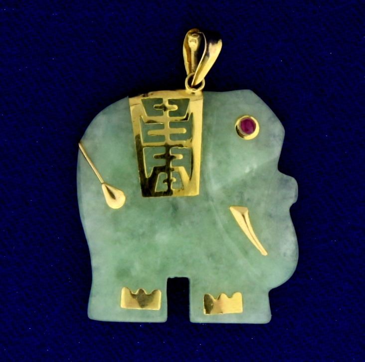In 10k yellow gold. Elephant eye is a 1.5mm natural ruby. Jade is excellent light green color with high polish. 1 1/8 inches long with bale. 4.0g.