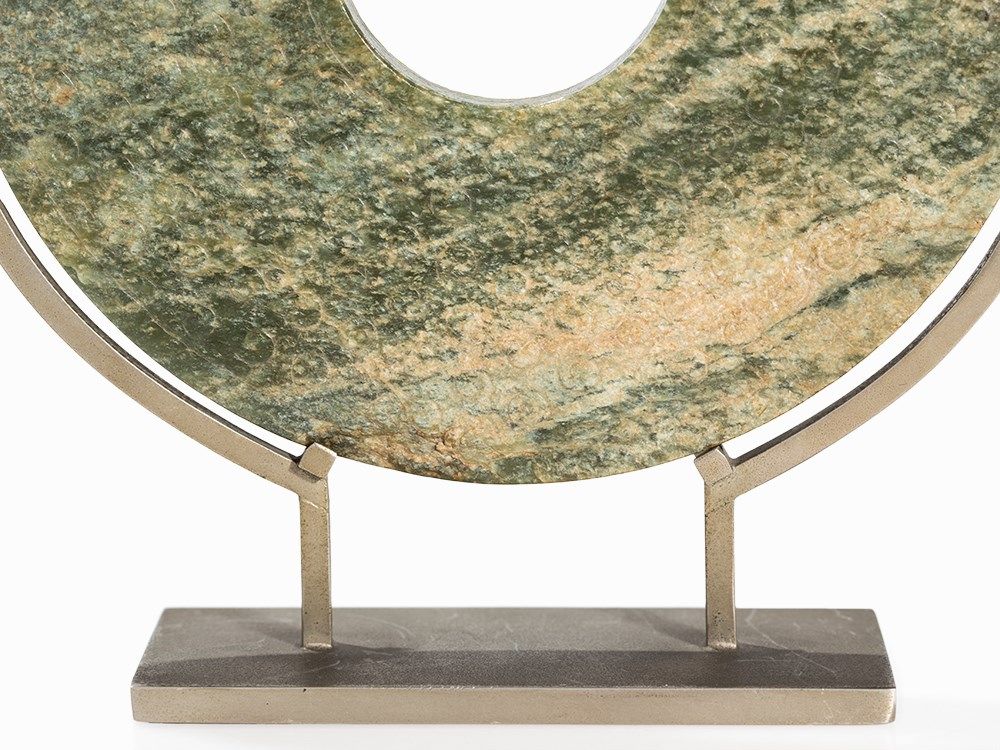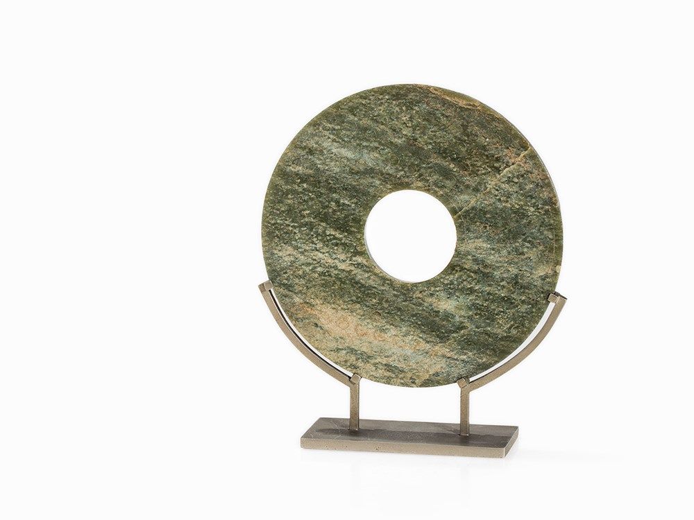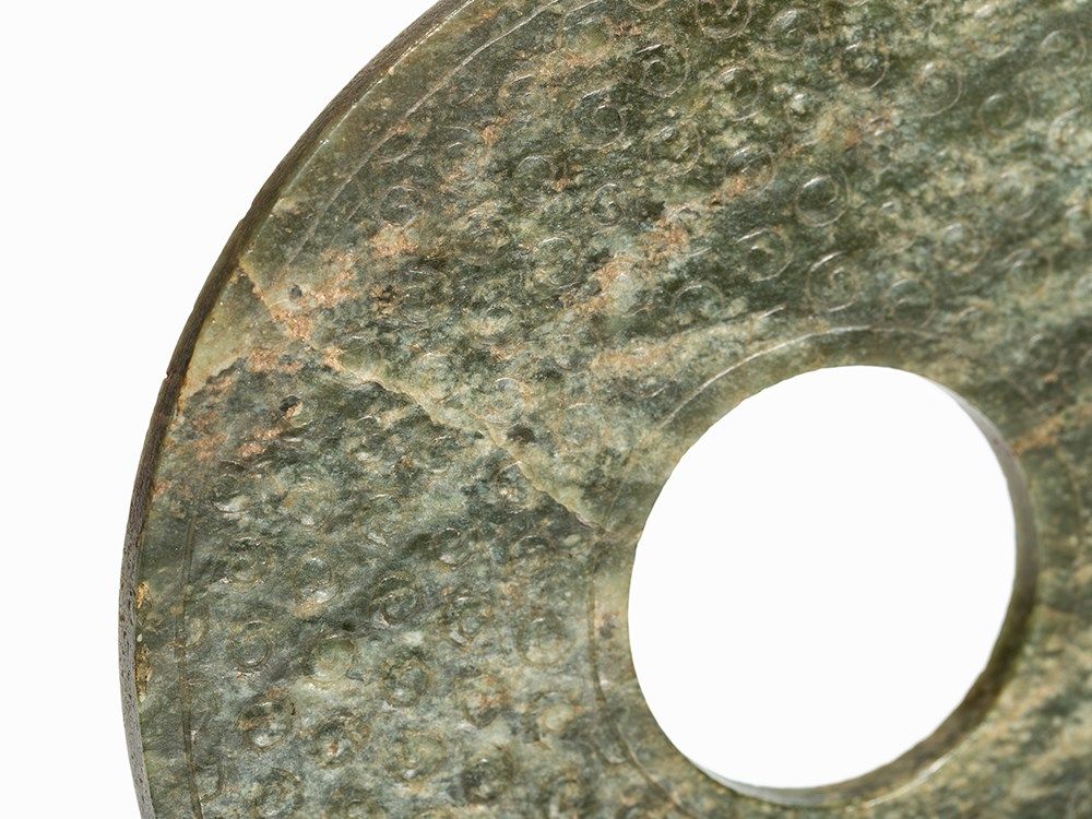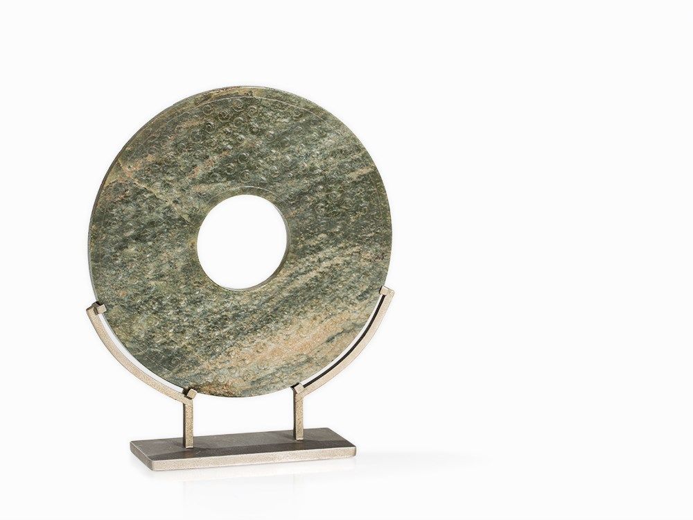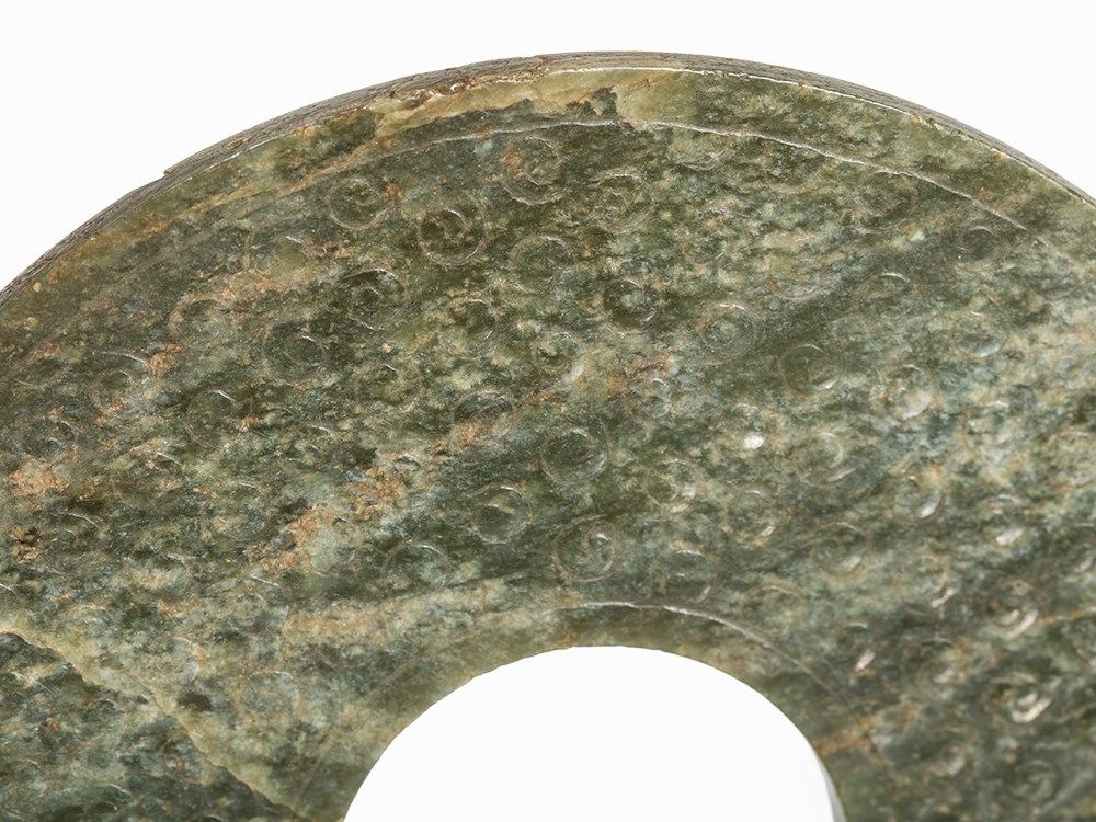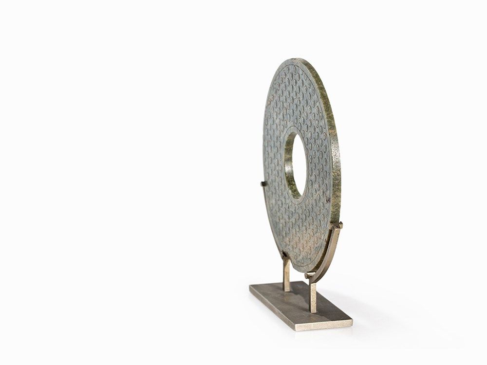 The present carving is modelled after archaic pieces from the Han Dynasty (206 BC – 220 AD). Early discs of this kind were burial objects and were placed upon the body of the deceased to ensure immortality in the afterlife.