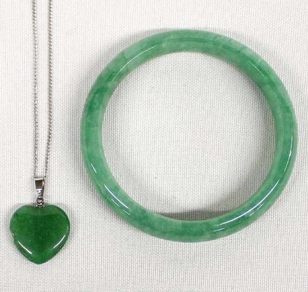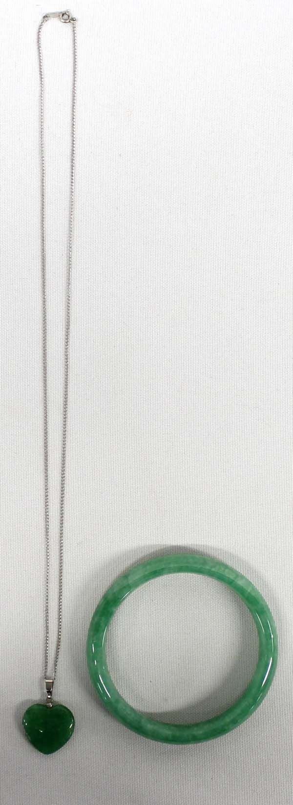 Jade Bangle Bracelet and Jade Heart Necklace, chain measures 18''L end to end, bracelet measures .5''W, pendant measures .75'' x 7/8''
