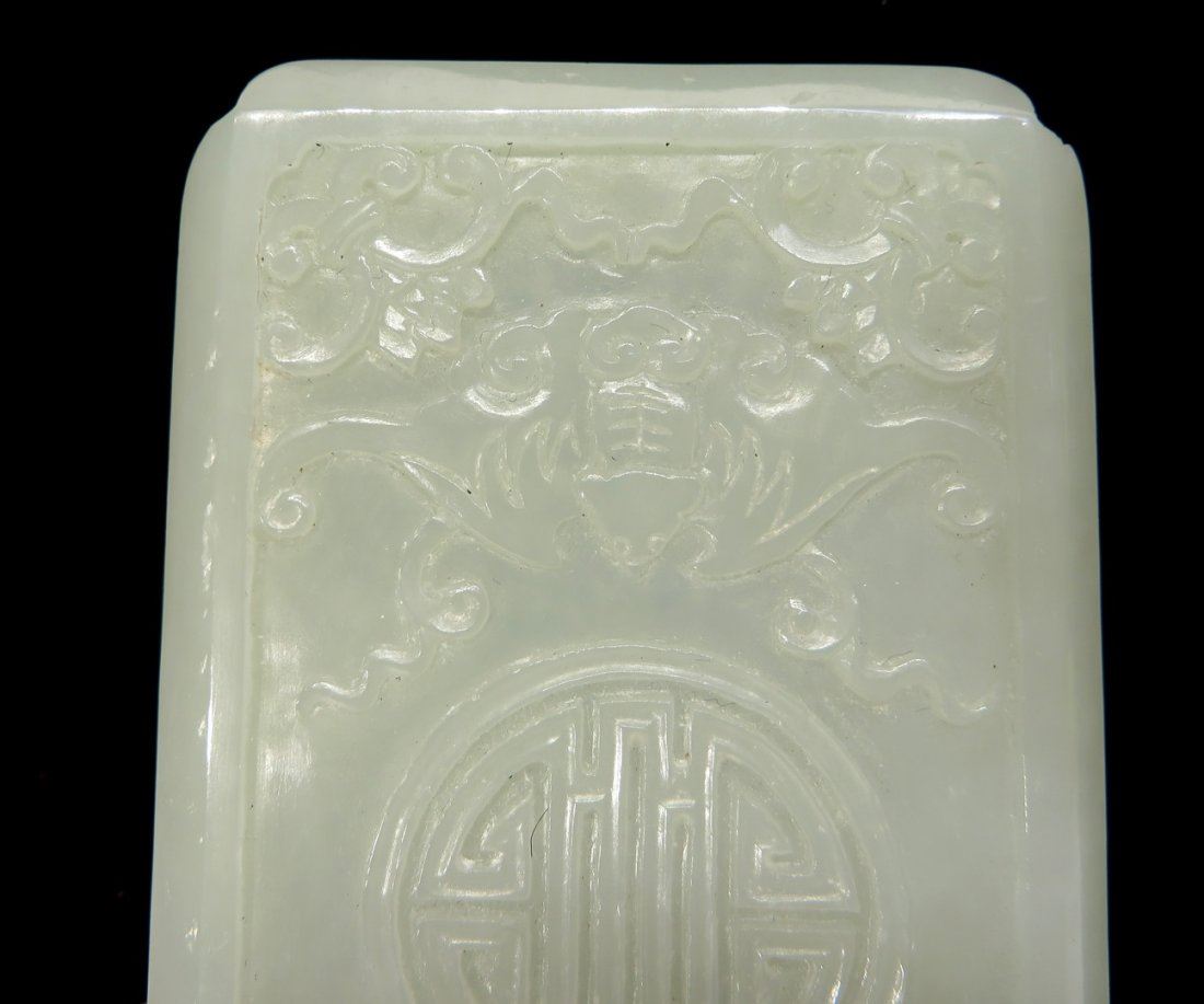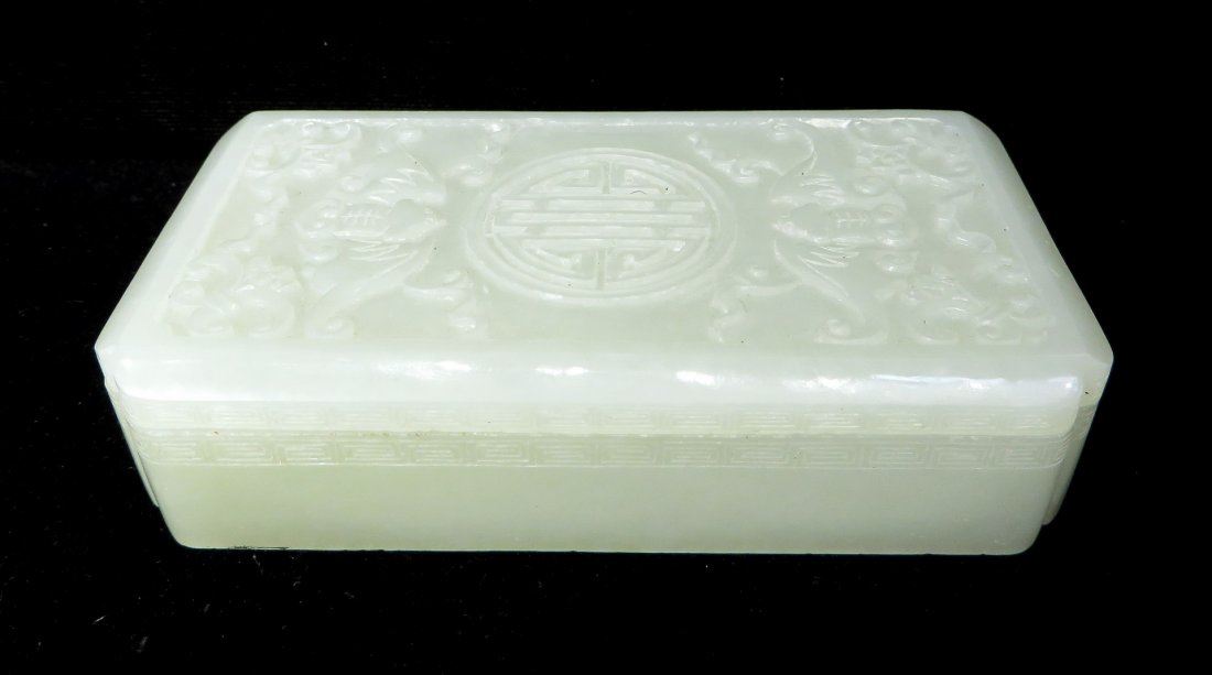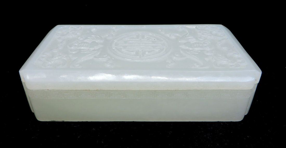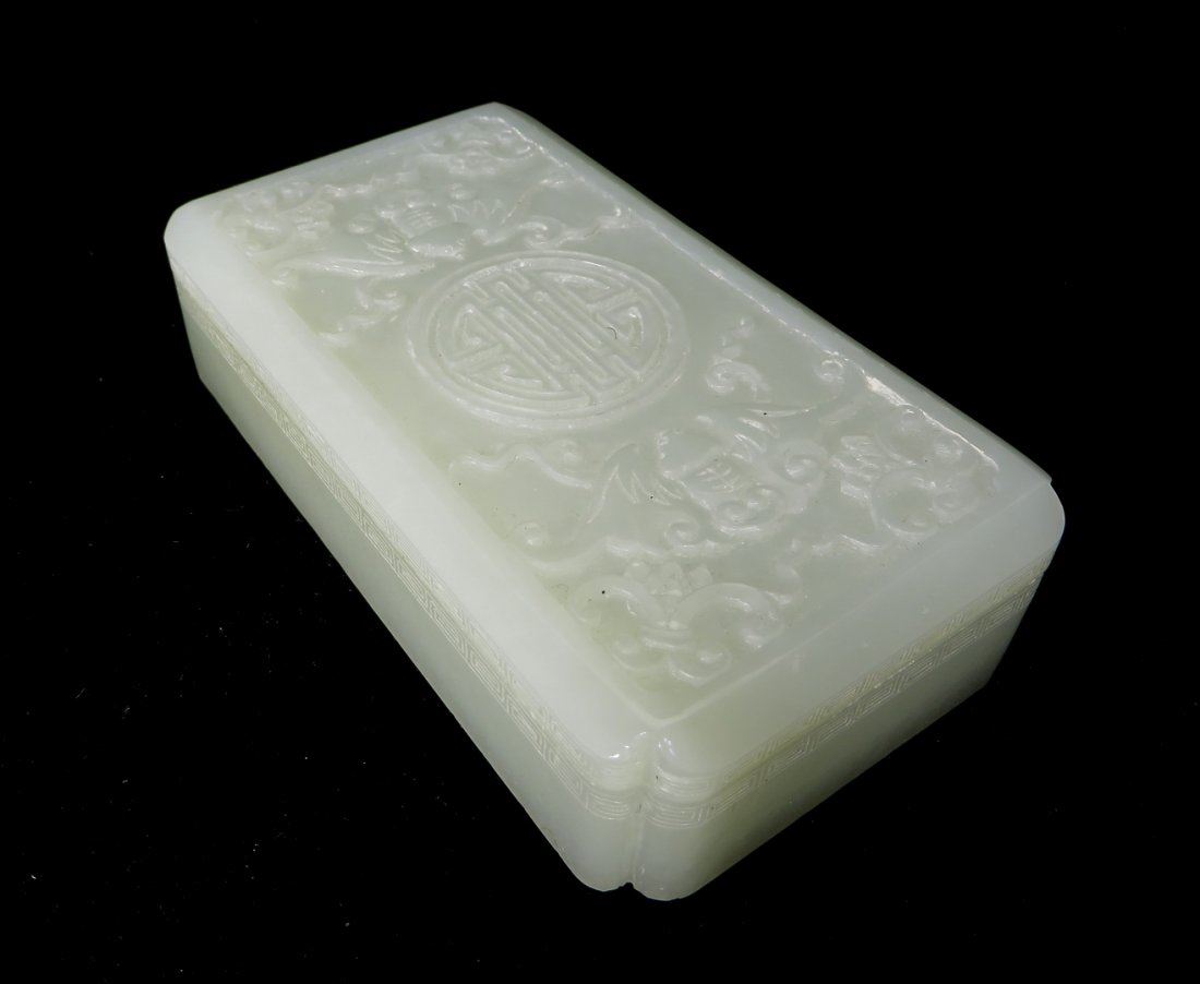 The lid of the box is carved with bats around a central character. The sides of the lid and base have a meander pattern. NO RESERVE! ! Most items in this sale have no reserve
