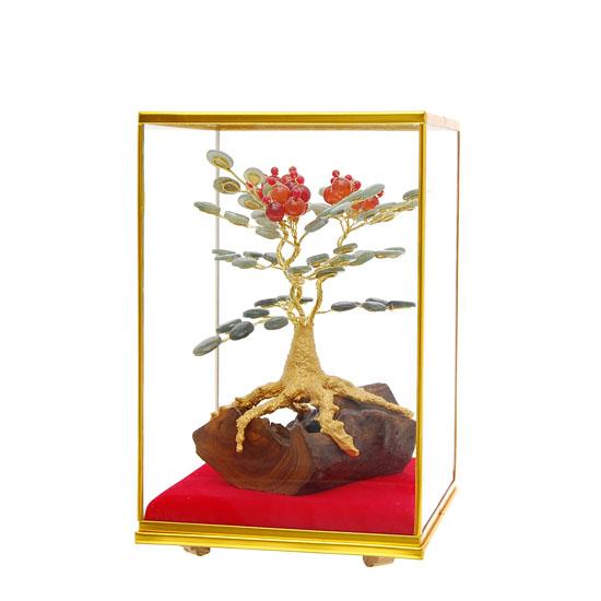 Excellent handcrafted piece with gilded tree branches on teak log base and in glass display case; 9"; MULTIPLES AVAILABLE