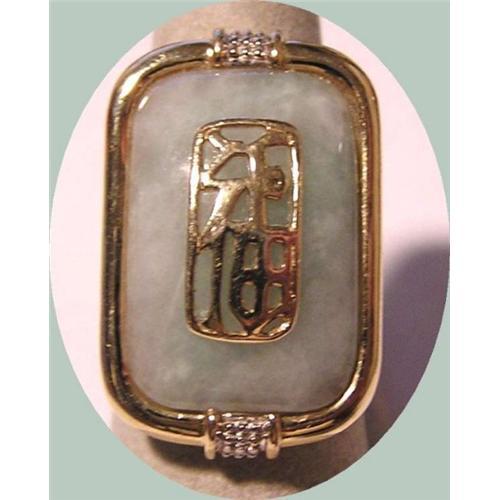 Oriental people regard Jade as a stone of Good Fortune. Your Good Fortune is here, in this stunning 14 Kt. Yellow Gold elongated ring with Jade stone. The top is rectangular, measuring 1 1/4" long and 7/8" across. The gold has been finely crafted in an open pattern with the "Good Fortune" Chinese letter on it. The Jade Stone is beautiful, bright and lustrous. Not at all porous in appearance as in less expensive jade. Even the reverse side of the stone is smooth and highly polished, a mark of quality construction! The ring is accented at the top and bottom with small white gold embellishment. The sides of the ring are elegantly crafted in an open design. Ring measures a Ladies Size 7 1/2. <p>We guarantee that this ring is exactly as advertised, a finely crafted 14 Kt. Yellow Gold ring with a quality Jade stone. It is covered by our 7 Day Refund Policy, as stated on About Me. The ring is much nicer than the photos.
