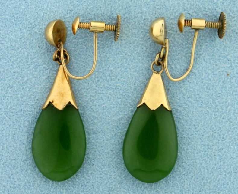 In 14k yellow gold, containing a 20x11mm teardrop shaped Jade gemstones with deep green color. 1 1/4 inch long with screw backs. For non pierced ears. 4.2g.