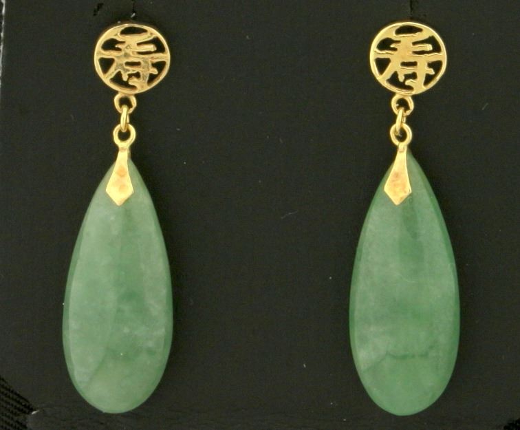 In 14k yellow gold, containing Chinese symbol for good luck. 1 1/8" long with friction backs. 19 1/2x8 1/4mm teardrop shaped Jade with excellent color and clarity. 3.0g.