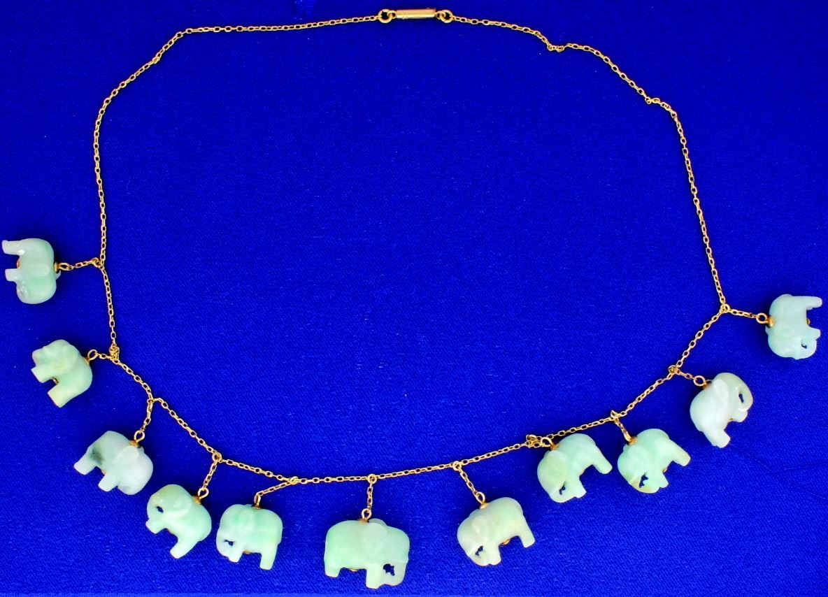 In 14K yellow gold, this necklace is 16 1/2 inches long and contains 11 jade elephants, each approximately 1/2 inch long. 30.0g
