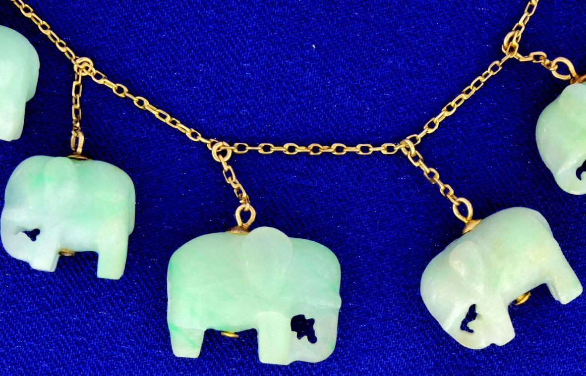 In 14K yellow gold, this necklace is 16 1/2 inches long and contains 11 jade elephants, each approximately 1/2 inch long. 30.0g