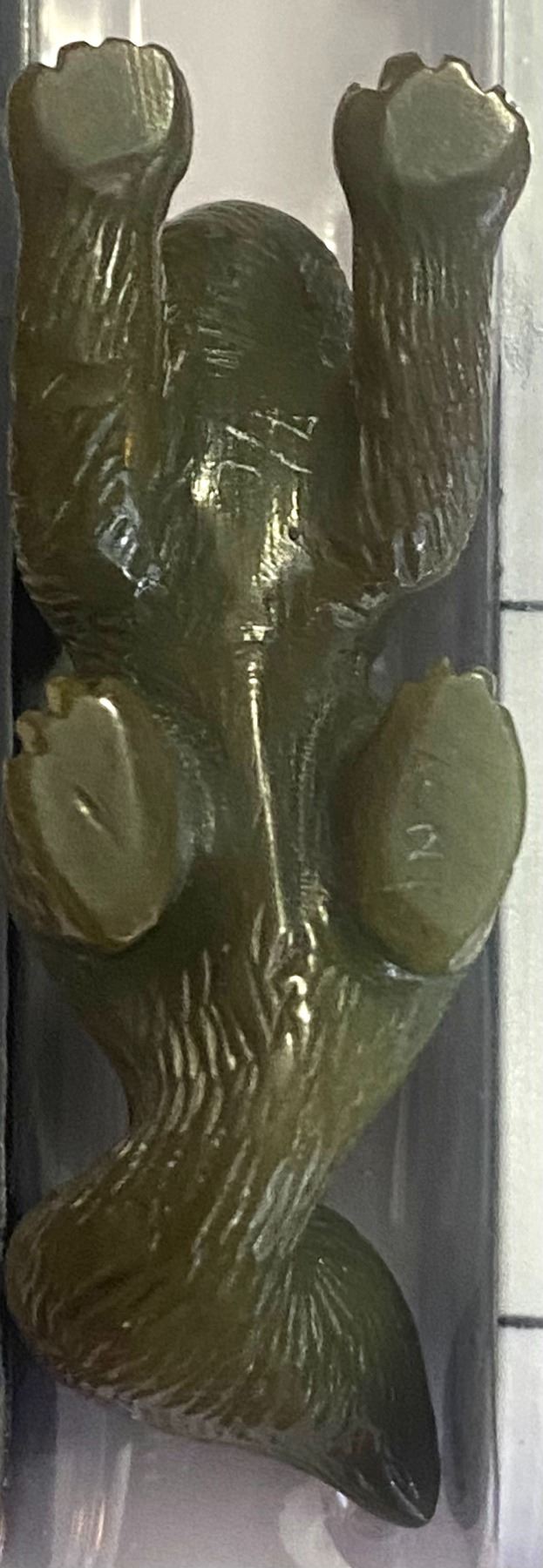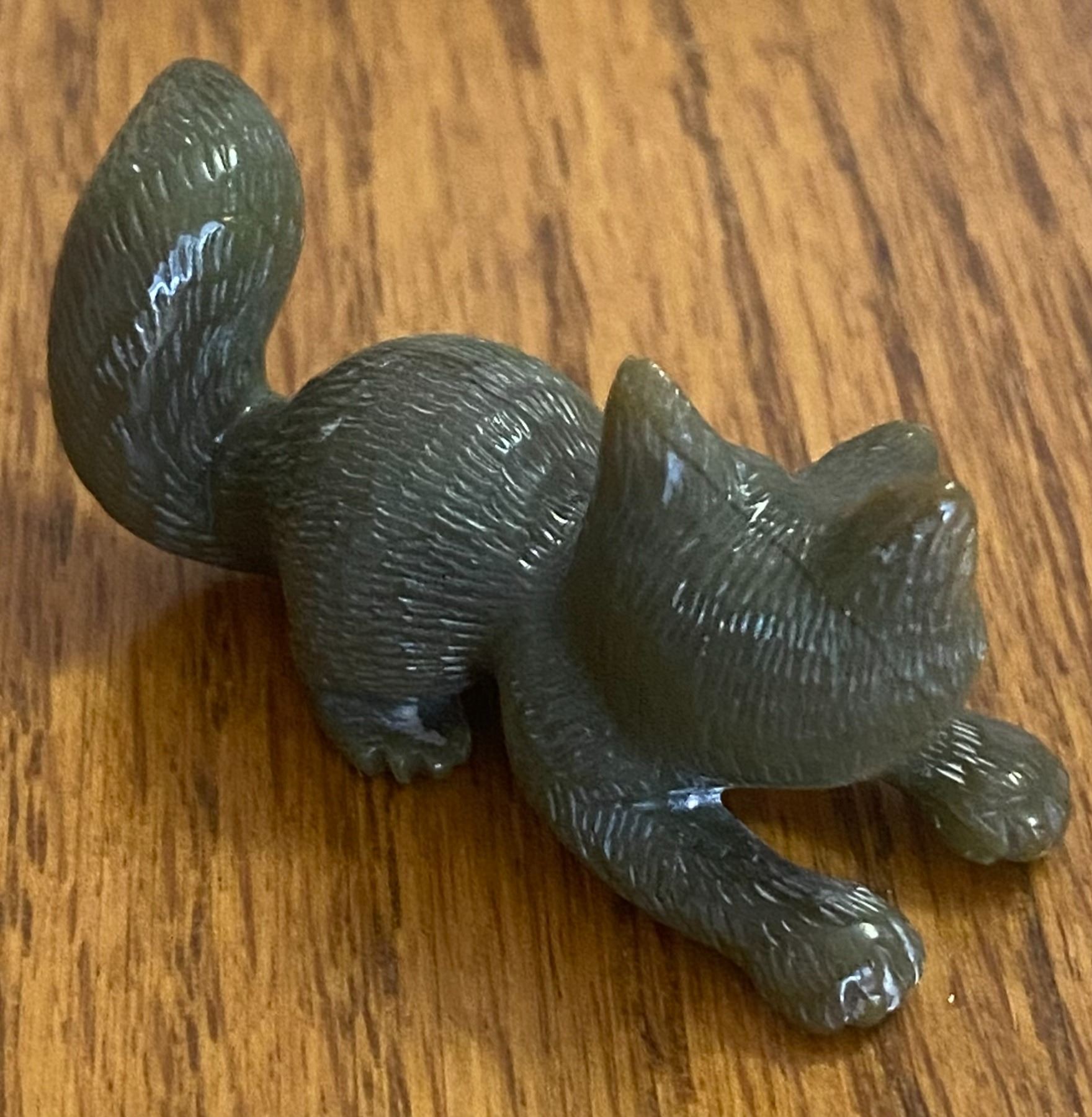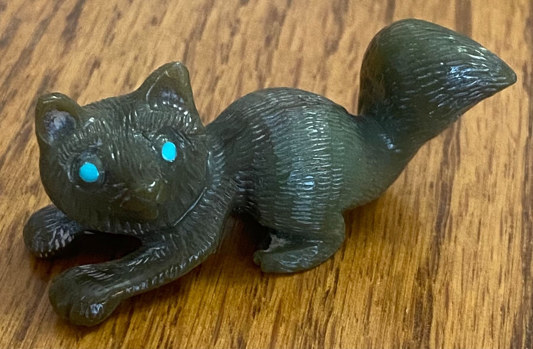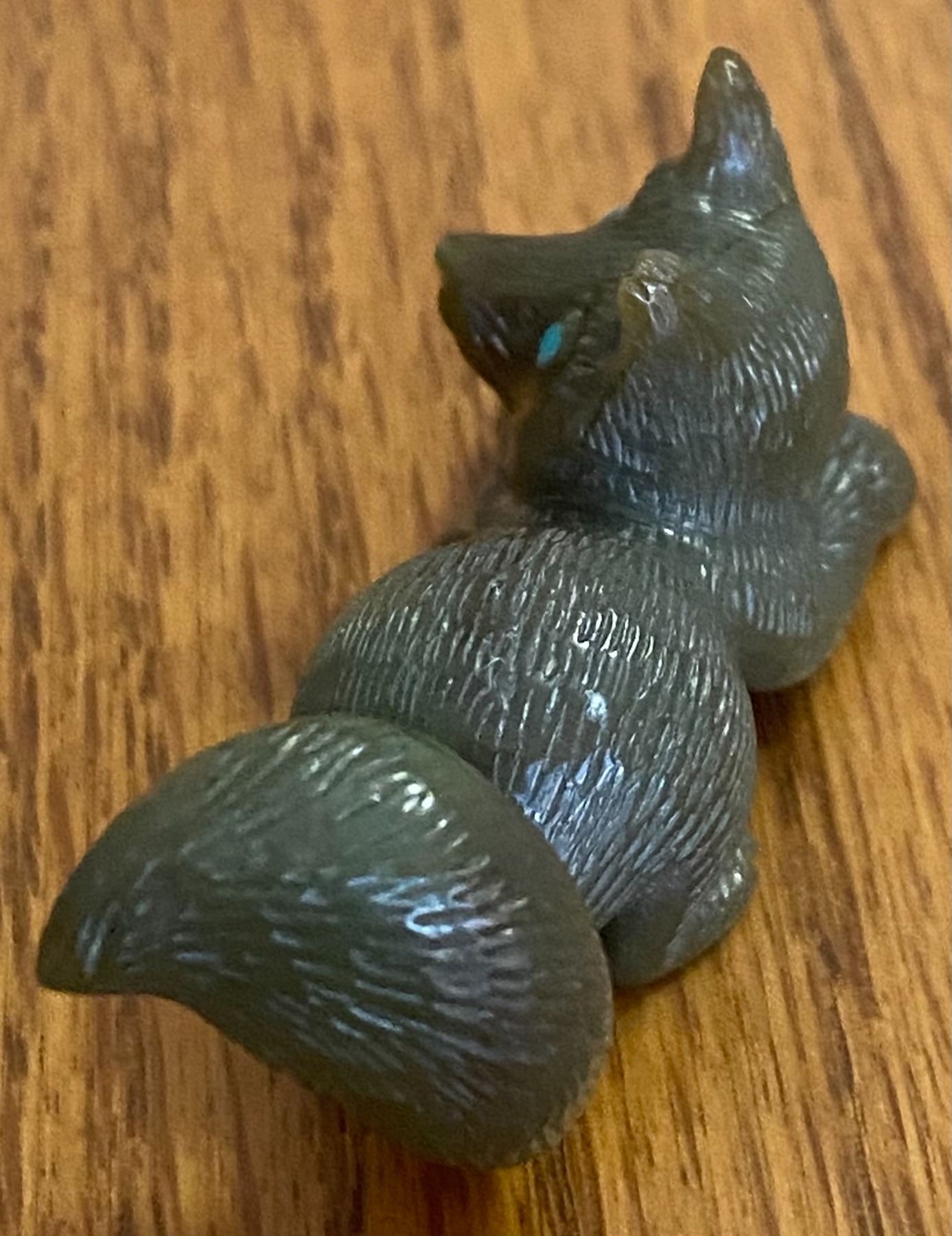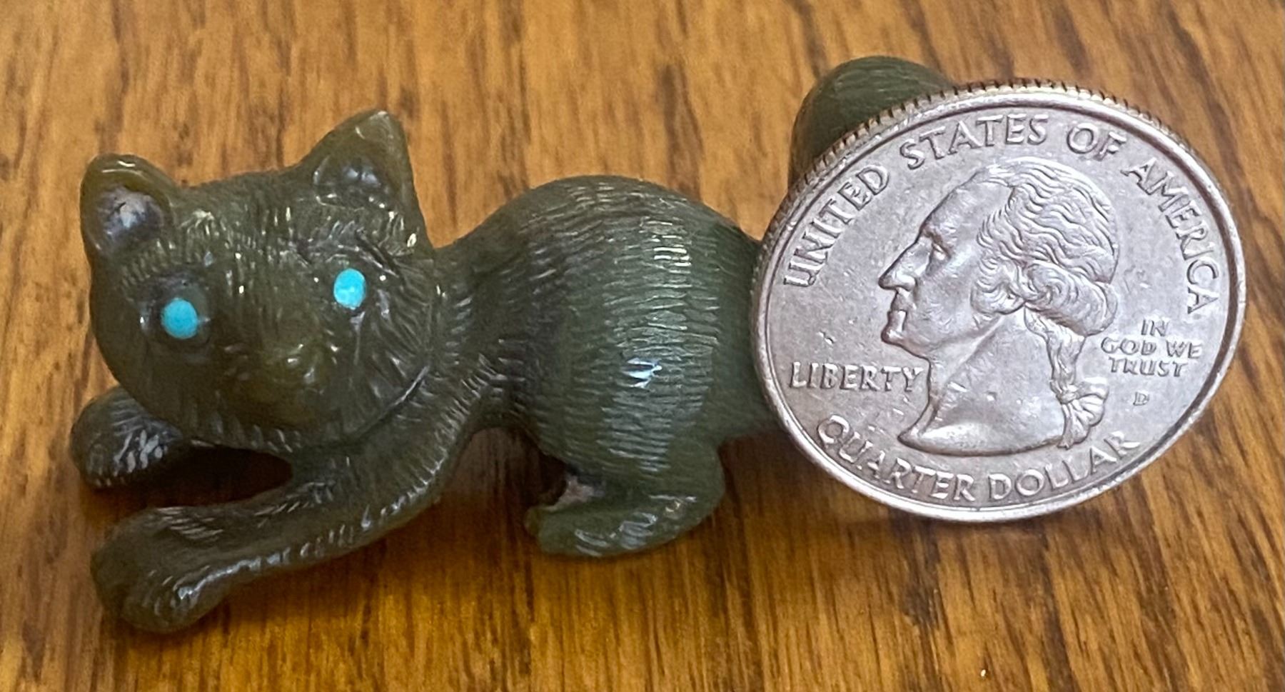 What a nice Jade Fox Fetish Carving with Turquoises Eye’s. Hallmarked 7/C (see pictures) between the front legs. Zuni is marked on the bottom of the back foot.