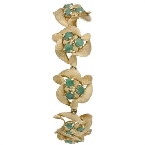 <B>Jade, Gold Bracelet</B></I> The bracelet, designed with a floral motif, features round-shaped jade cabochons, set in Florentine finished 14k yellow gold links. Gross weight 33.20 grams.<BR><I>Dimensions: 7-1/2 inches x 13/16 inch </B></I><BR><BR><b>Shipping:</b> Miscellaneous Collectibles, Smal (<a target="_blank" href="http://www.heritageauctions.com/common/shipping.php">view shipping information</a>)