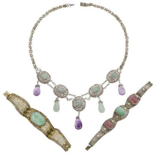 <B>Jade, Multi-Stone, Silver Jewelry Lot</B></I> The lot includes: one necklace centering five pendants, enhanced by marquise-shaped jade cabochons, dangling jade and amethyst drops, set in silver accented by filigree <I>(Dimensions: 22 inches x 2-5/8 inches)</B></I>; one hinged bracelet, featuring an oval-shaped jade tablet carving, enhanced by filigree, set in silver with vermeil accents <I>(Dimensions: 7 inches x 1-3/16 inches)</B></I>; together with one hinged bracelet, designed with a floral motif, featuring a modified oval-shaped jade cabochon, enhanced by modified oval-shaped pink tourmaline cabochons, accented by filigree, set in silver <I>(Dimensions: 6-1/2 inches x 1 inch)</B></I>. Gross weight for the lot is 136.70 grams.<BR><BR><b>Shipping:</b> Miscellaneous Collectibles, Smal (<a target="_blank" href="http://www.heritageauctions.com/common/shipping.php">view shipping information</a>)