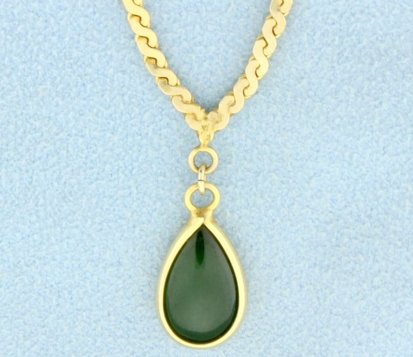 In 14K yellow gold, there is a 12x8mm pear shaped jade on a 16 1/2 inch necklace. 6.4g