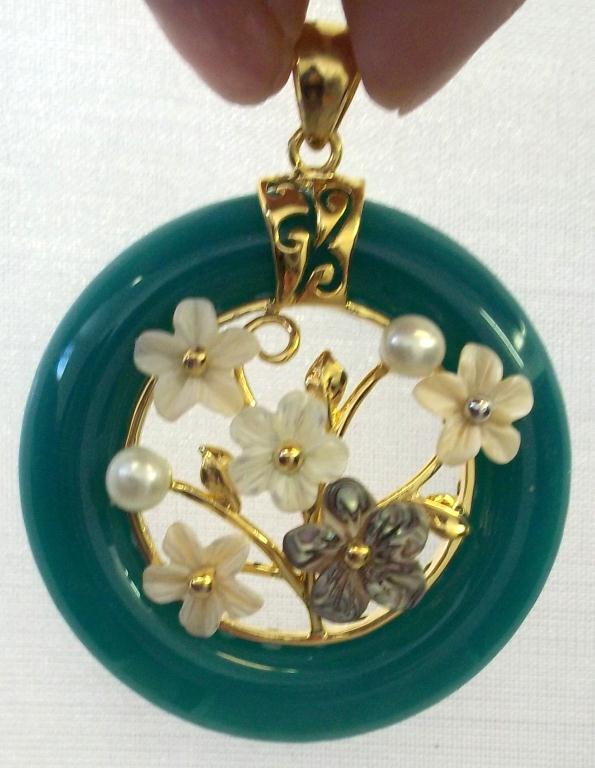 Vermeil (gold plated over sterling silver) setting. Flowers are 1 White, 1 Abalone style, 3 Pink. A Very Unique Custom Pendant.