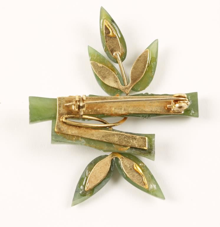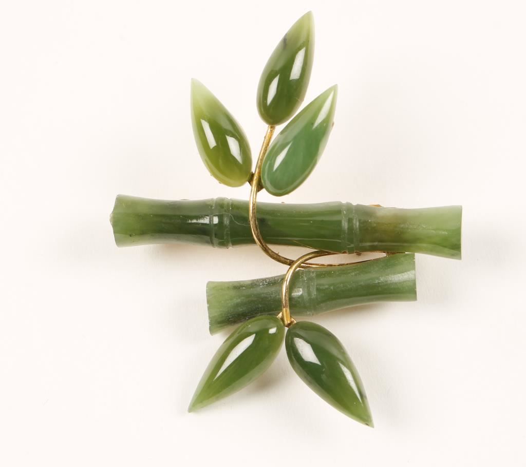 Two stalks of bamboo in jade with delicate gold wires crossing in front of stalks that end in jade leaves. A pretty, delicate piece.