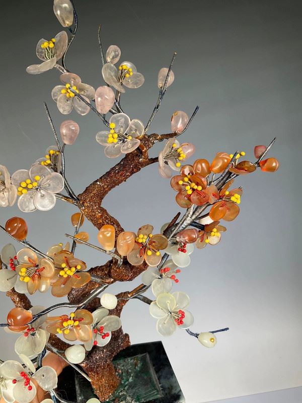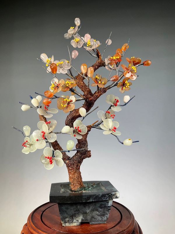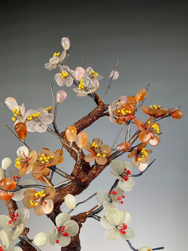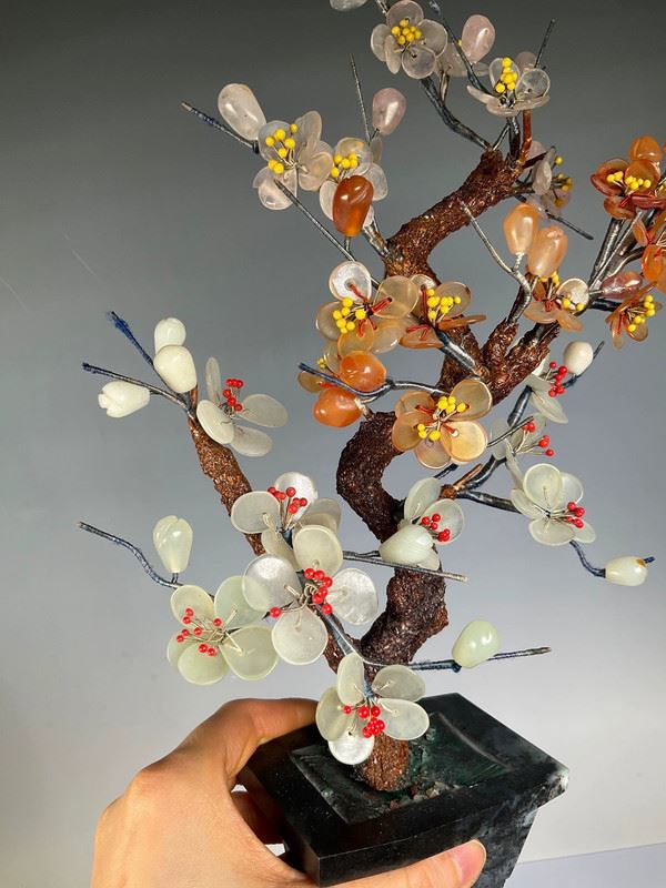 This exquisite jade bonsai sculpture features the plum blossom as its central theme. The trunk and branches are meticulously carved from jade, reflecting the natural texture and smooth luster of the material. The petals of the plum blossoms are made from intricately crafted colorful jade, showcasing the unique elegance and resilience of the flower. Each blossom is lifelike, as if blooming in the cold winter, symbolizing the spirit of perseverance. This piece is not only a work of art but also a tribute to the strength and vitality of nature.
