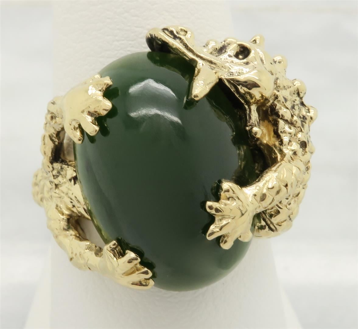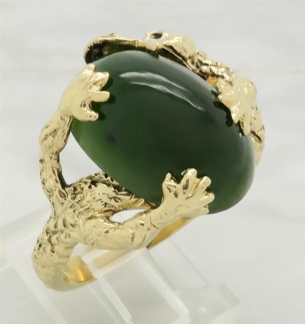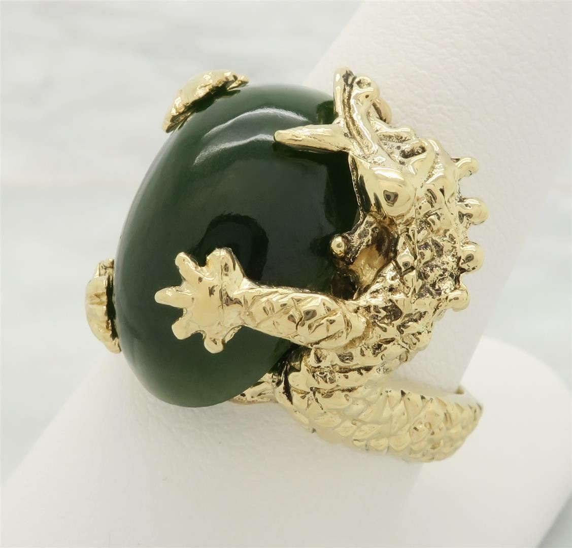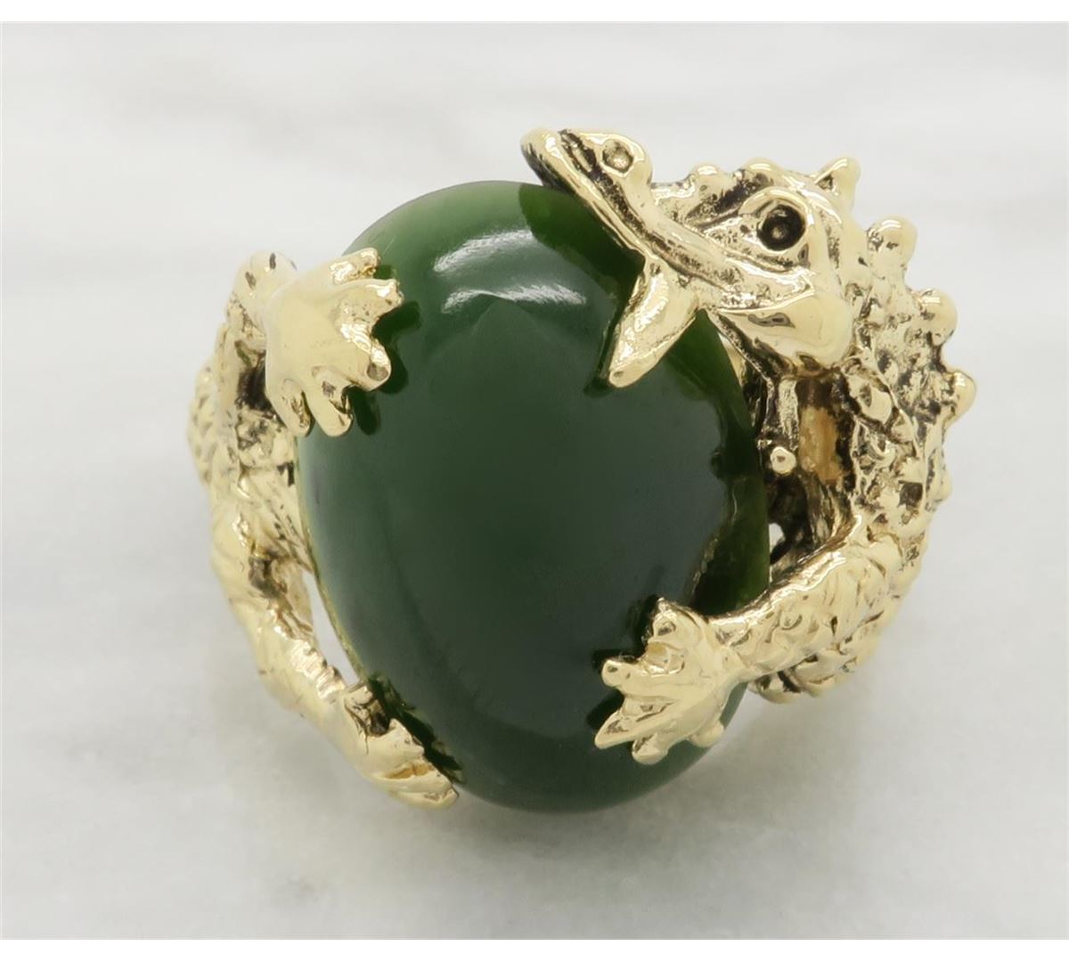 One tested 14K yellow gold jade ring. Containing: One Jade Gemstone Jade Size: 18.0MMx12.8MM Weight of ring: 11.6 grams, Size: 7.75