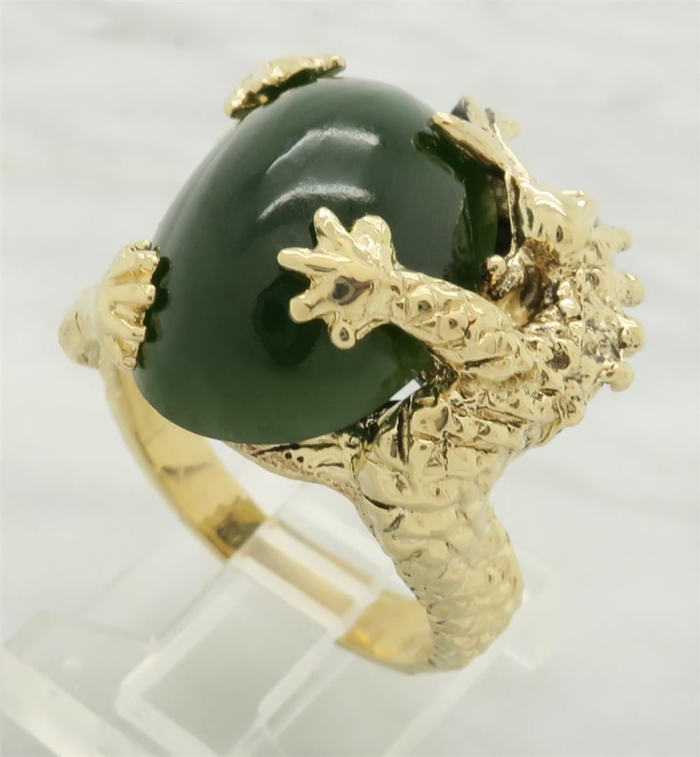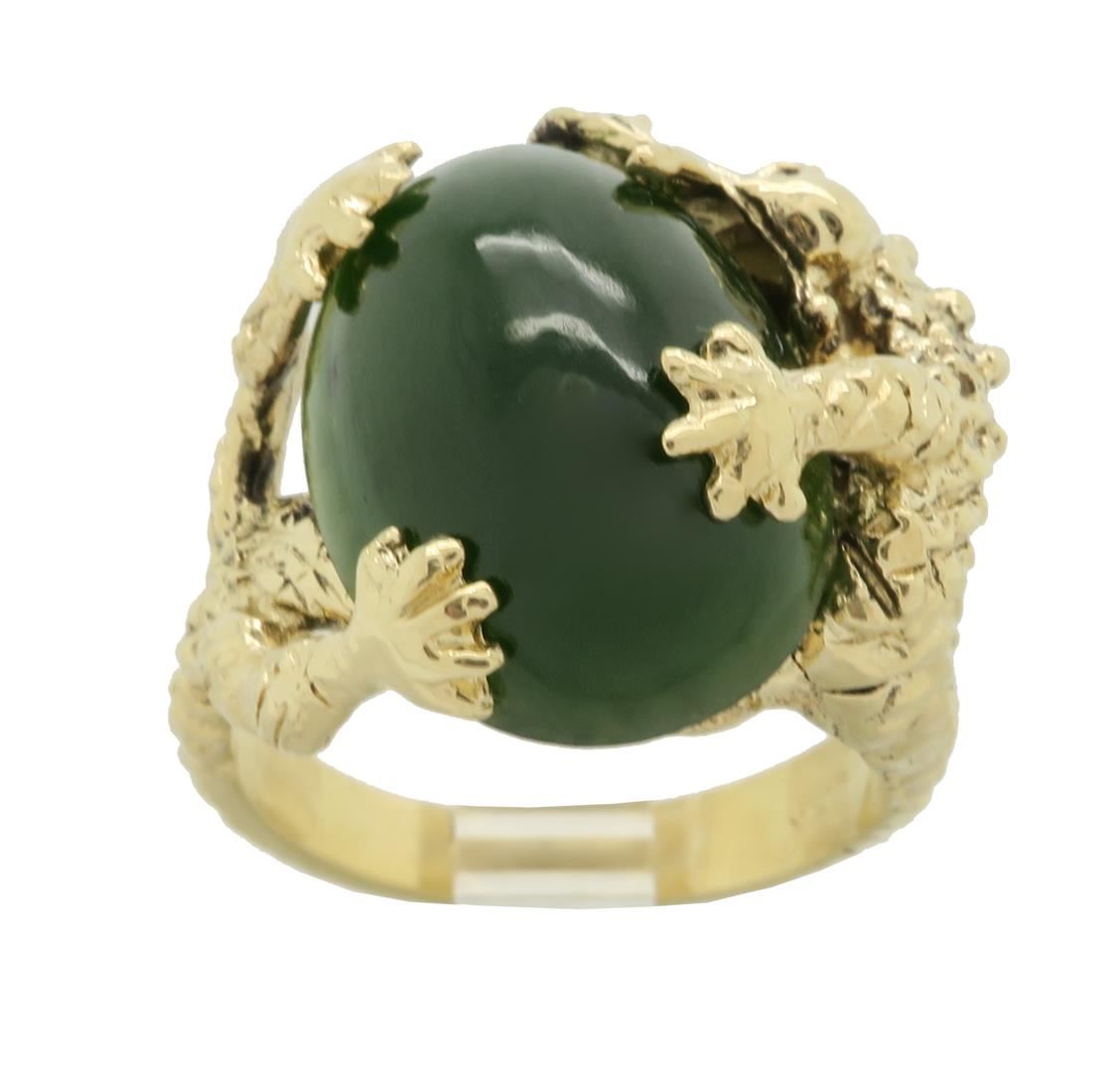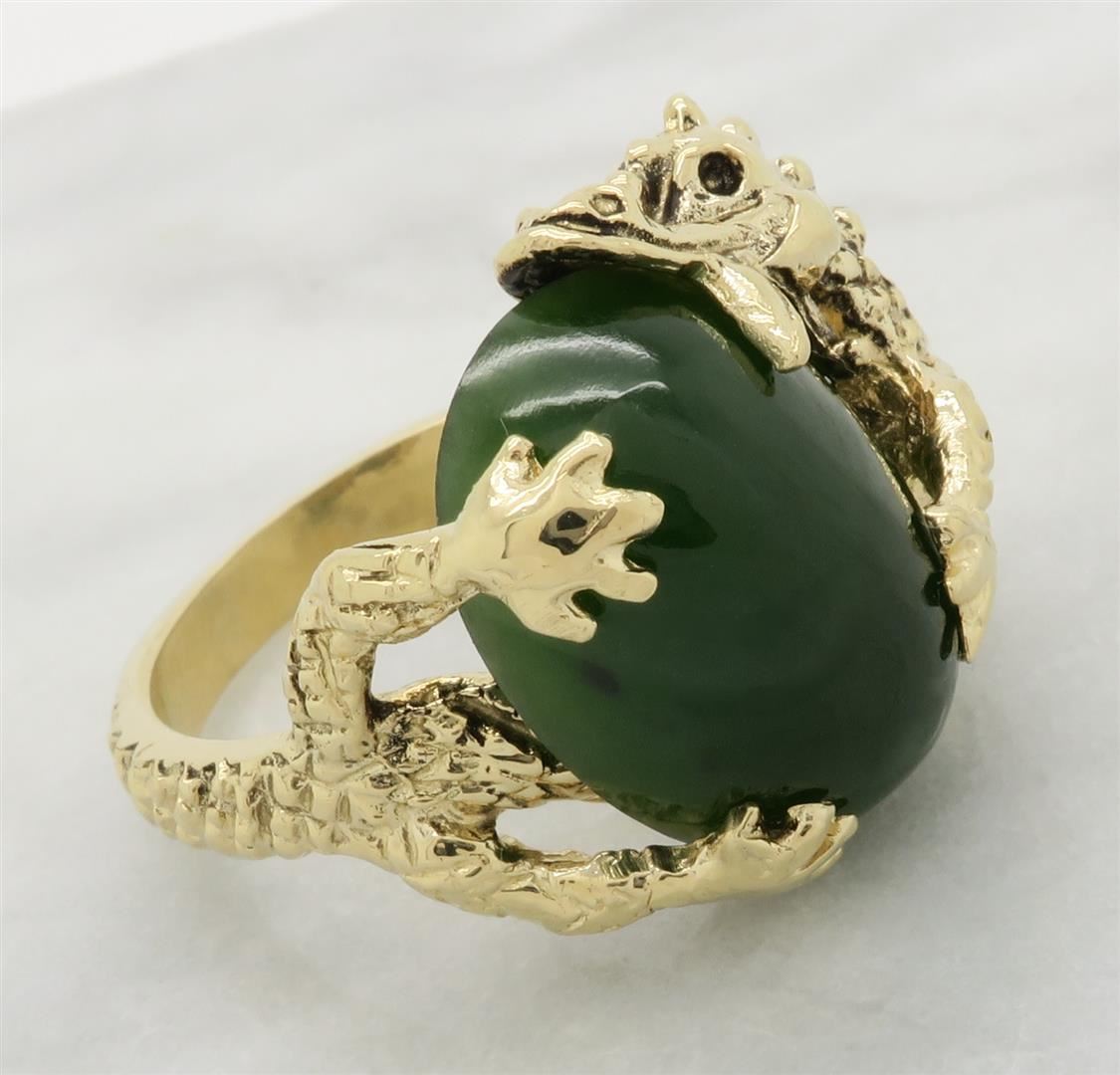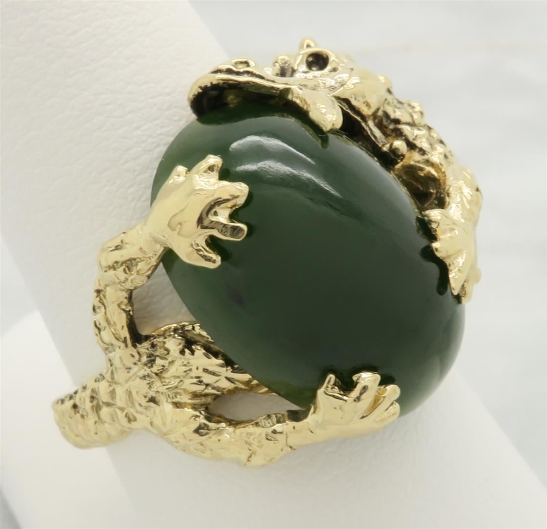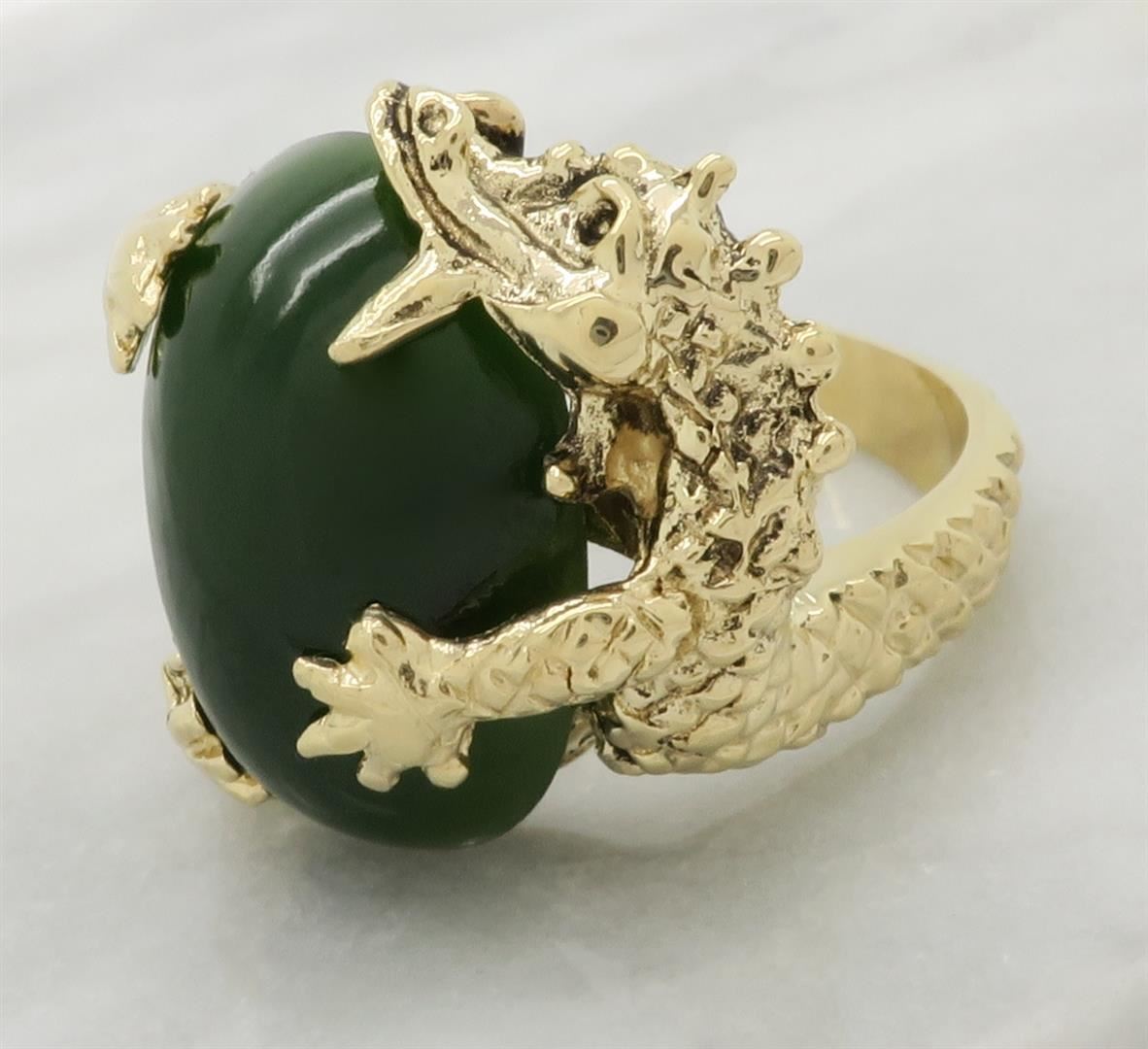 One tested 14K yellow gold jade ring. Containing: One Jade Gemstone Jade Size: 18.0MMx12.8MM Weight of ring: 11.6 grams, Size: 7.75