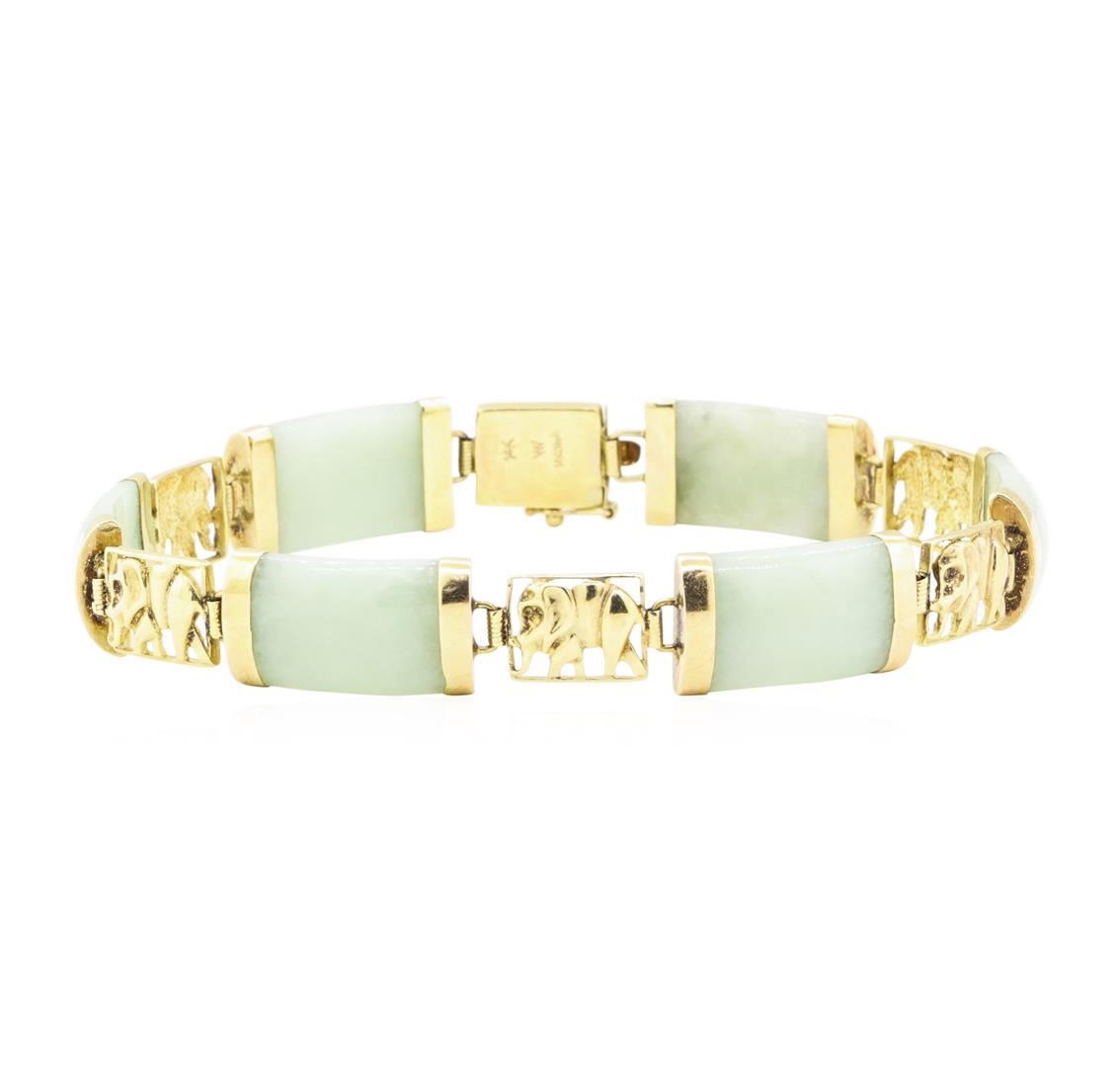 One jade station bracelet measuring seven and three quarter inches in length featuring: 14KT yellow gold weighing 16.5 grams containing six pieces of jade.