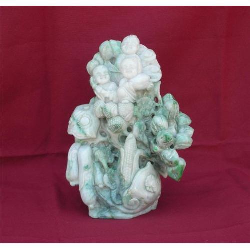 This piece is a very happy and warm jade stone display item. Three little kids are being surrounded by lots of vegetables and fruits in the farmland. This item symbolizes the good harvest of the year for the farmer family. The carving technique is good and mature and it covers almost every part of the stone. Surely it is a good option to become one of the collection for your display shelf.