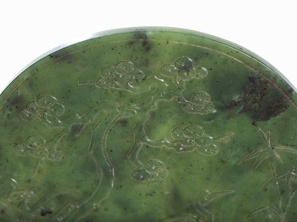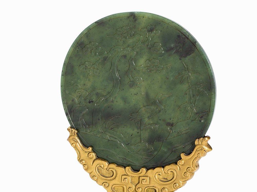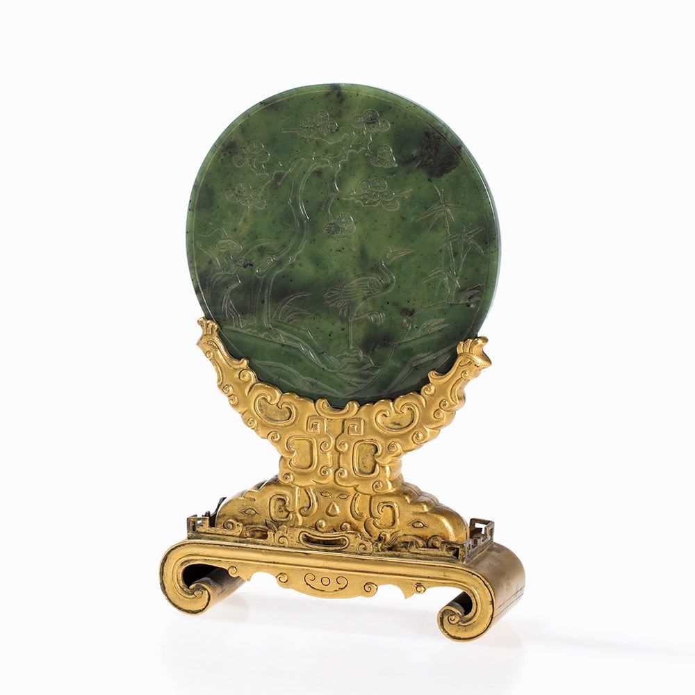 Table screens made of jade were particularly popular during the Qing Dynasty. They were usually of rectangular or round shape and often came in pairs. Their function was purely decorative and thus they were decorated with symbolic, auspicious motifs such as pine and crane, bat and deer, rising sun, etc. Small screens, such as the present piece, were valued as aesthetic objects for the scholar's desk.