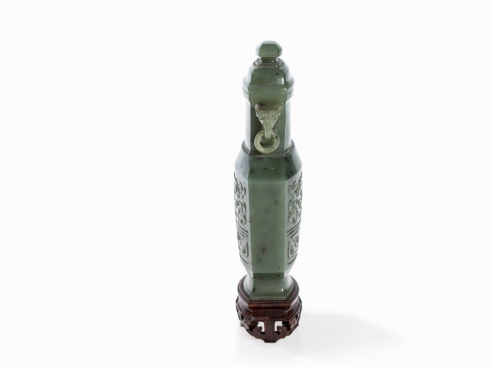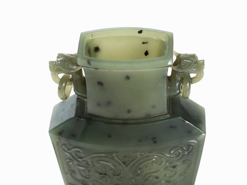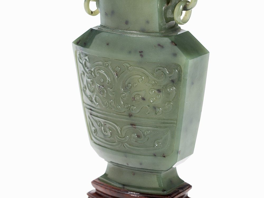 This vase belongs to a group impressive jade vases inspired – in form and decoration – by early archaic bronzes. The taste of the Chinese emperor Qianlong, who was an admirer of the arts and crafts of the Bronze Age, entailed a renaissance of archaic shapes and motifs influencing jade carvers and other artisans in the 18th and 19th centuries.