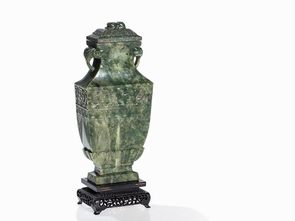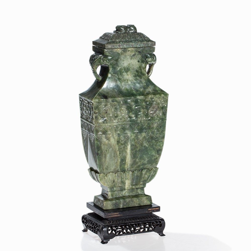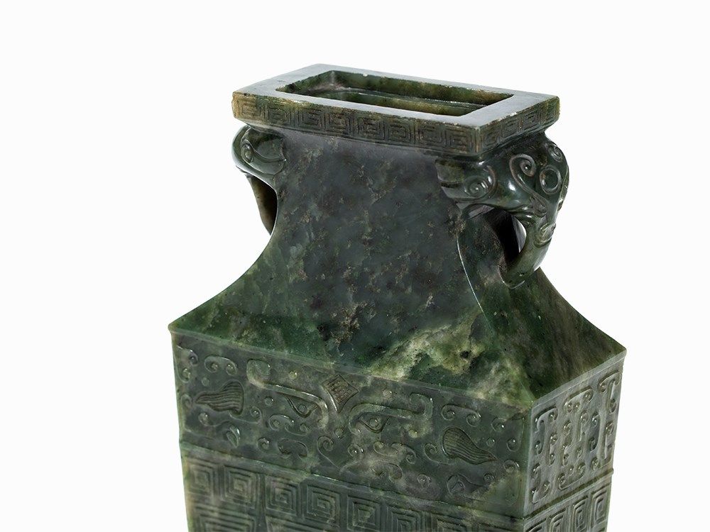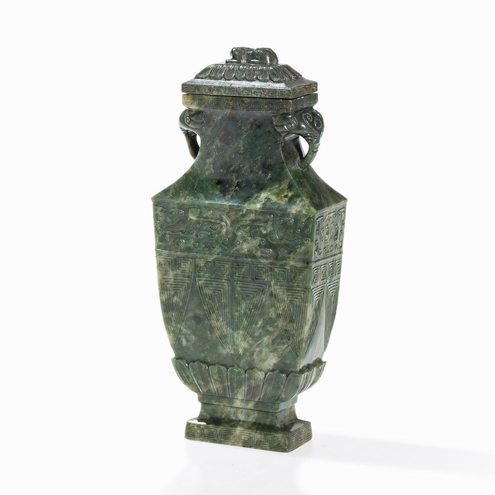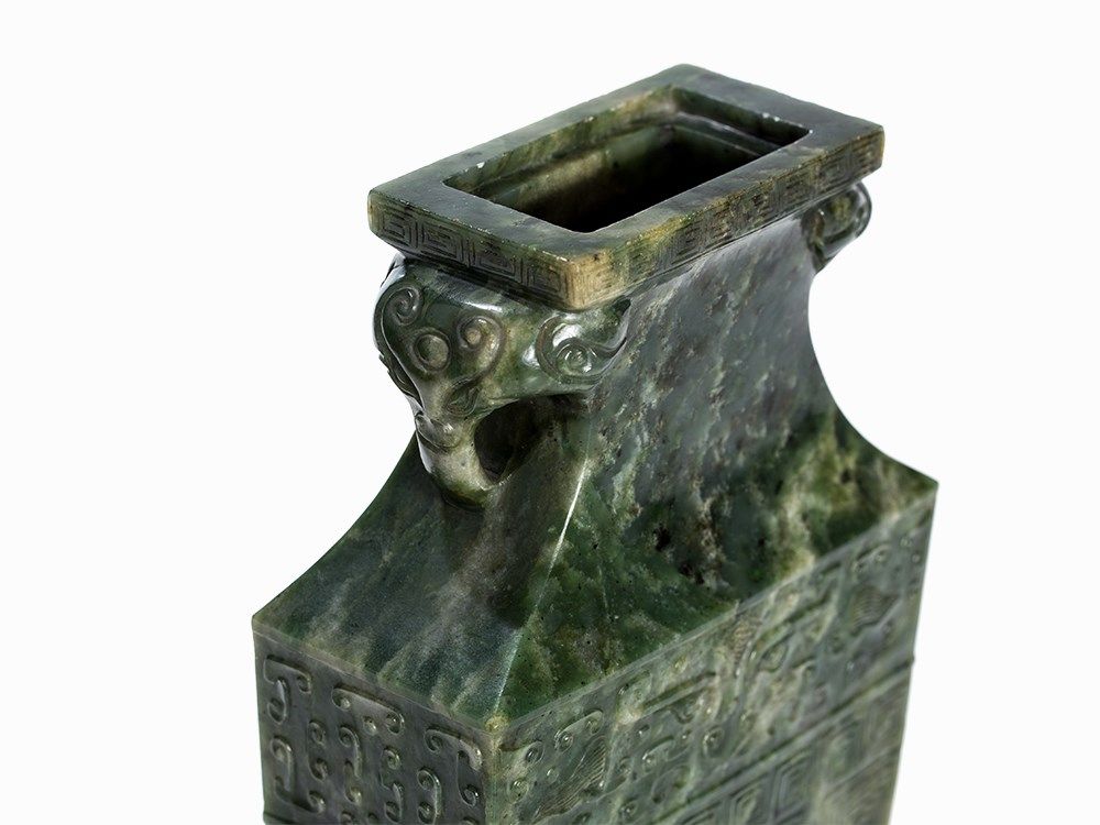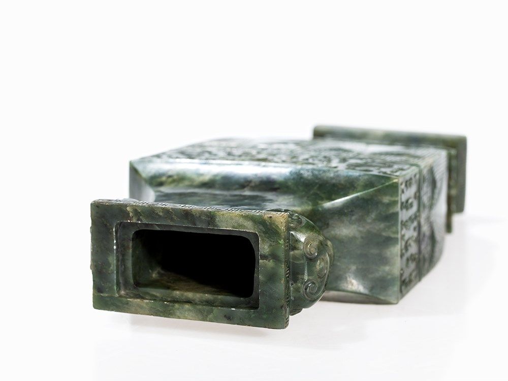 This vase belongs to a group impressive jade vases inspired – in form and decoration – by early archaic bronzes. The taste of the Chinese emperor Qianlong, who was an admirer of the arts and crafts of the Bronze Age, entailed a renaissance of archaic shapes and motifs influencing jade carvers and other artisans in the 18th and 19th centuries.