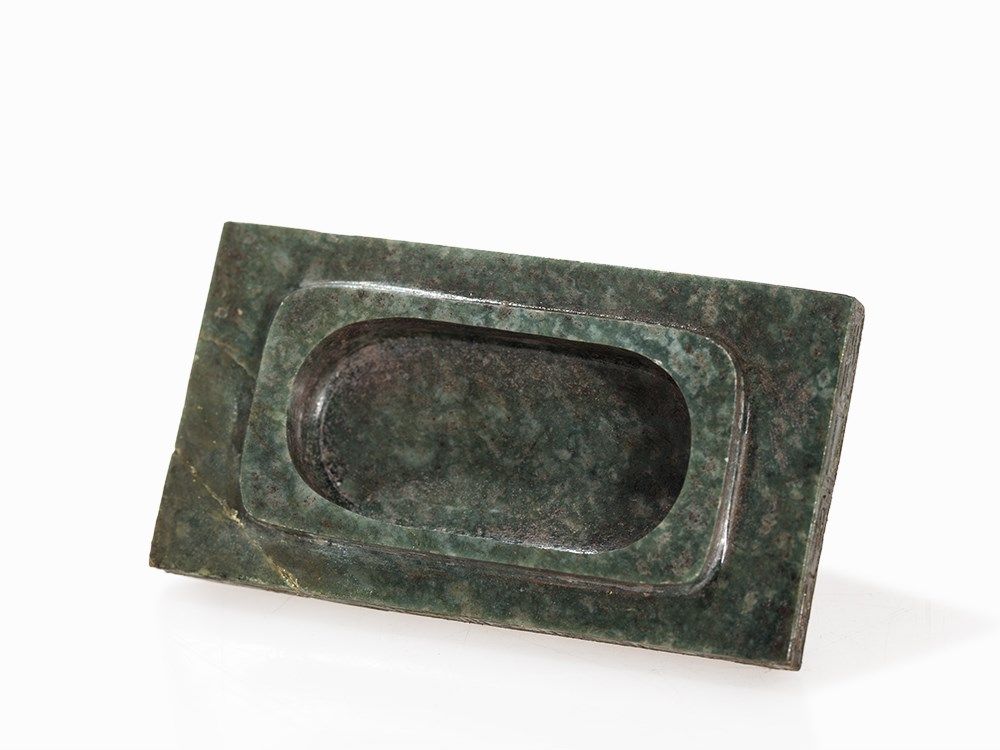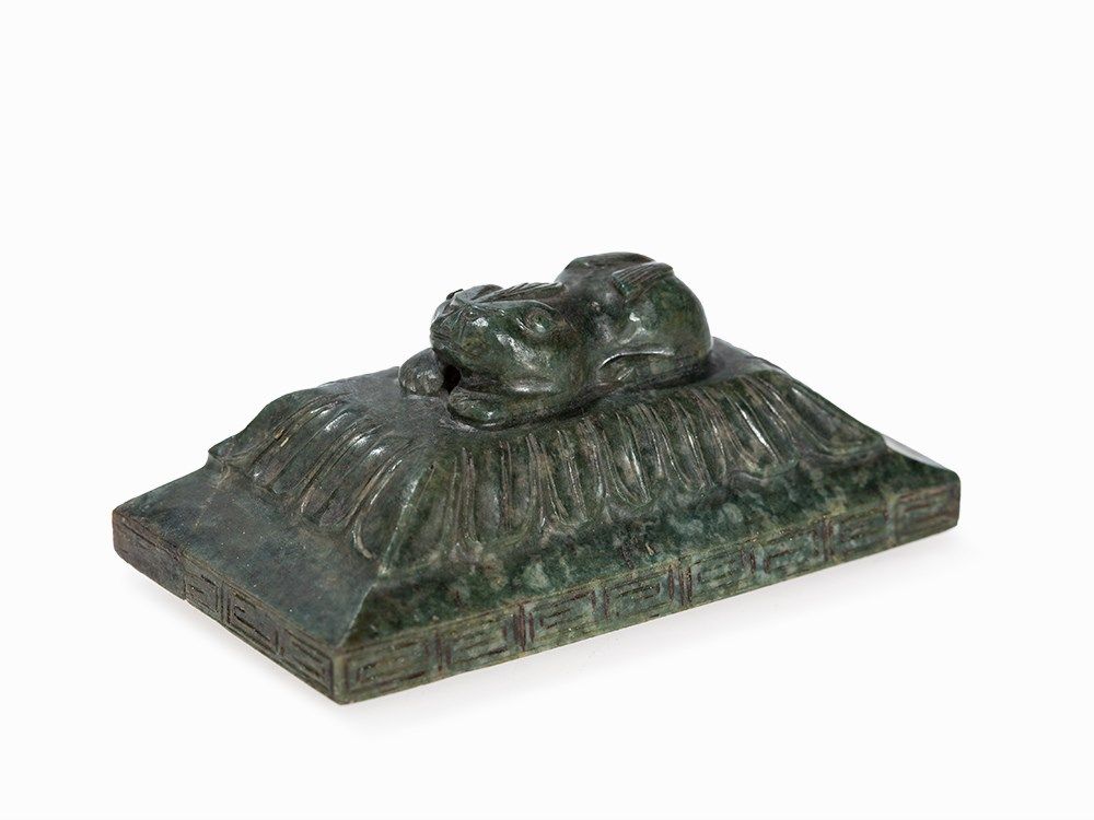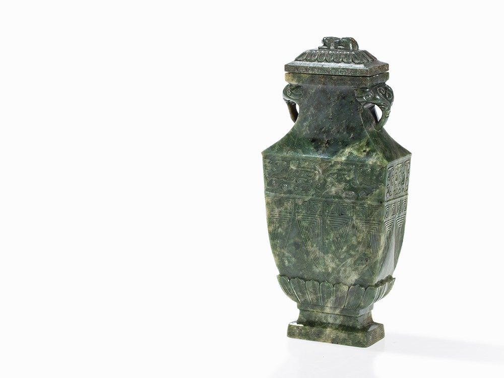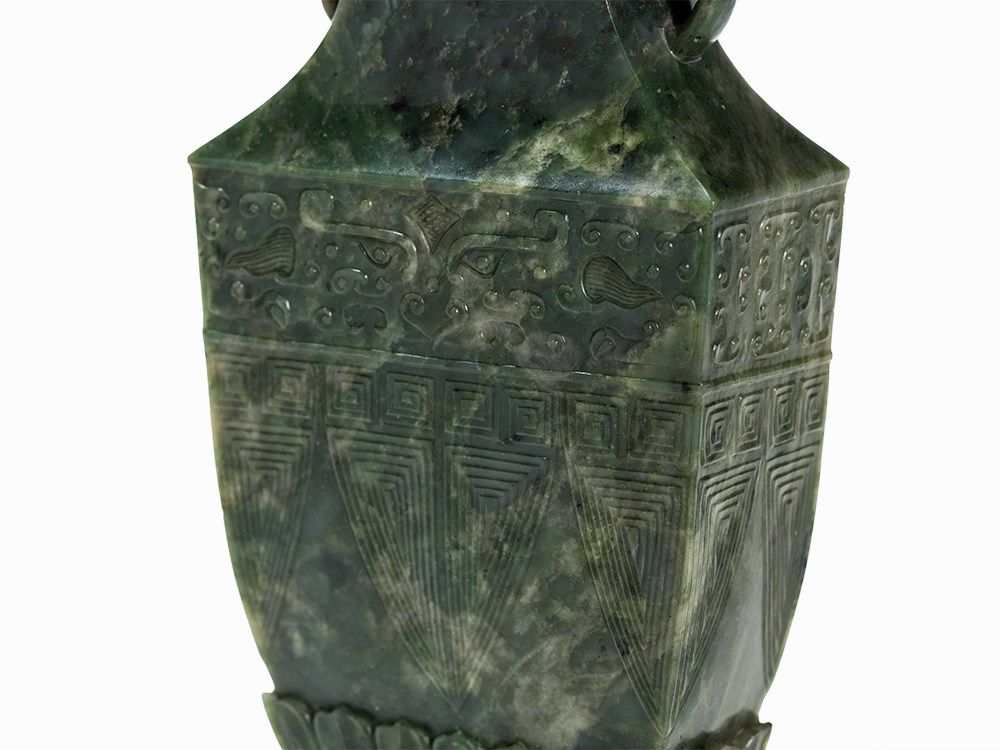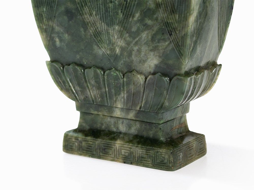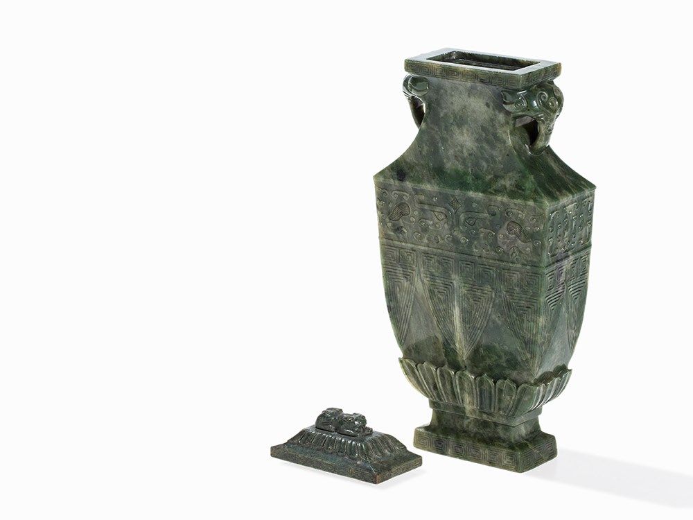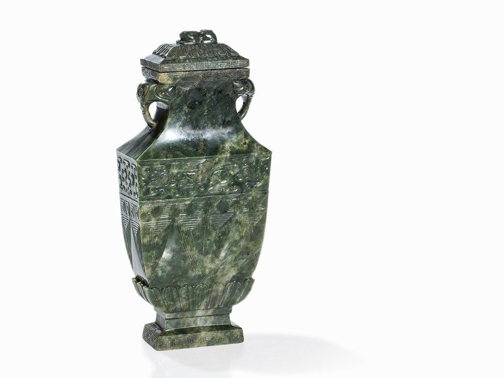 This vase belongs to a group impressive jade vases inspired – in form and decoration – by early archaic bronzes. The taste of the Chinese emperor Qianlong, who was an admirer of the arts and crafts of the Bronze Age, entailed a renaissance of archaic shapes and motifs influencing jade carvers and other artisans in the 18th and 19th centuries.